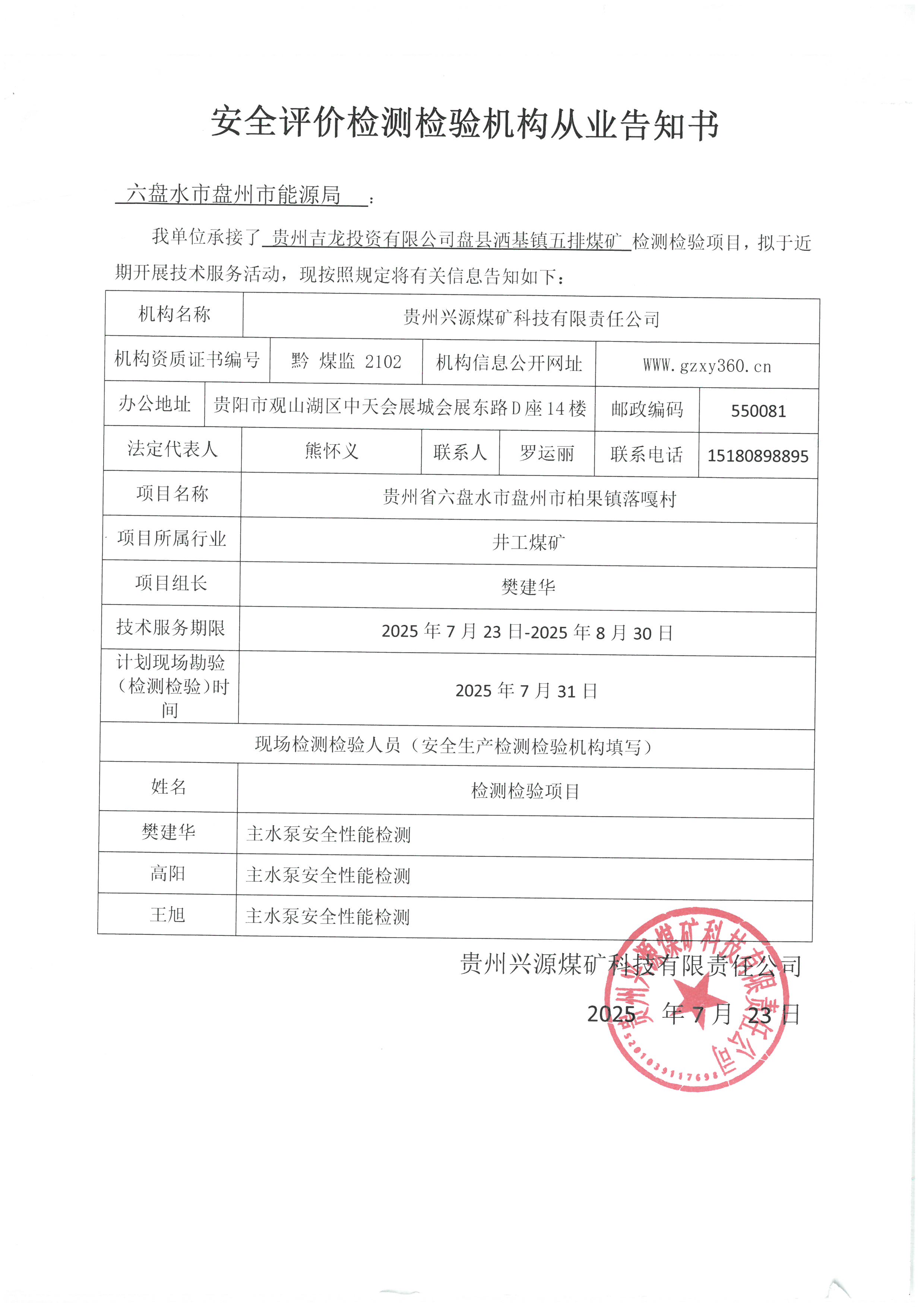 安全評(píng)價(jià)檢測檢驗(yàn)機(jī)構(gòu)從業(yè)告知書[貴州吉龍投資有限公司盤縣灑基鎮(zhèn)五排煤礦]