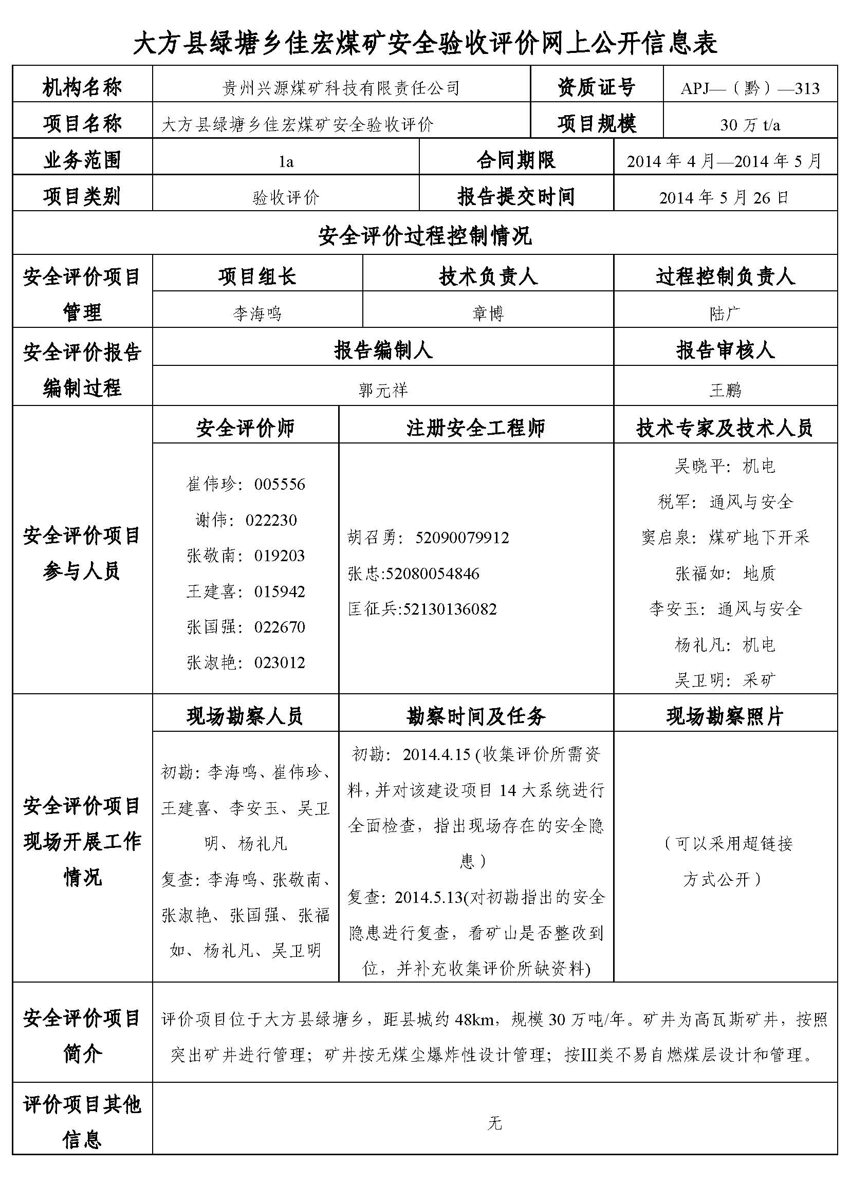 大方縣綠塘鄉(xiāng)佳宏煤礦安全驗收評價網(wǎng)上公開信息表