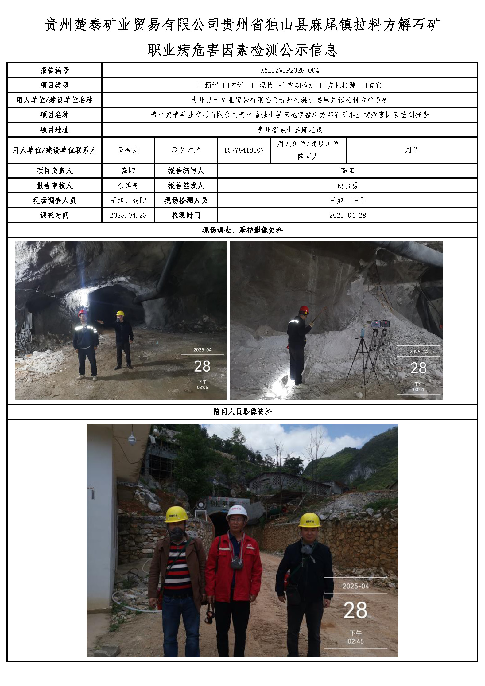 貴州楚泰礦業(yè)貿(mào)易有限公司貴州省獨(dú)山縣麻尾鎮(zhèn)拉料方解石礦職業(yè)病危害因素檢測(cè)公示信息