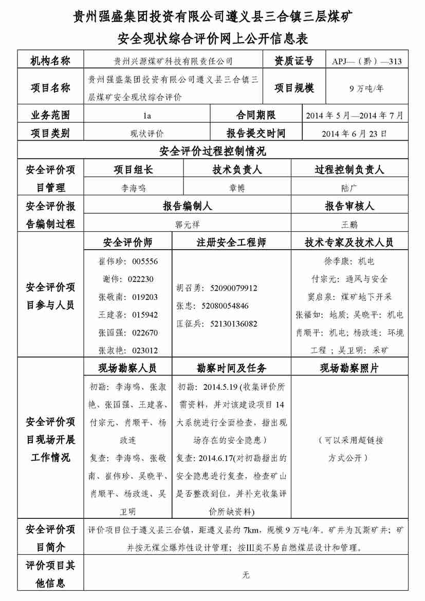 貴州強盛集團投資有限公司遵義縣三合鎮(zhèn)三層煤礦安全評價業(yè)務(wù)網(wǎng)上公開信息表