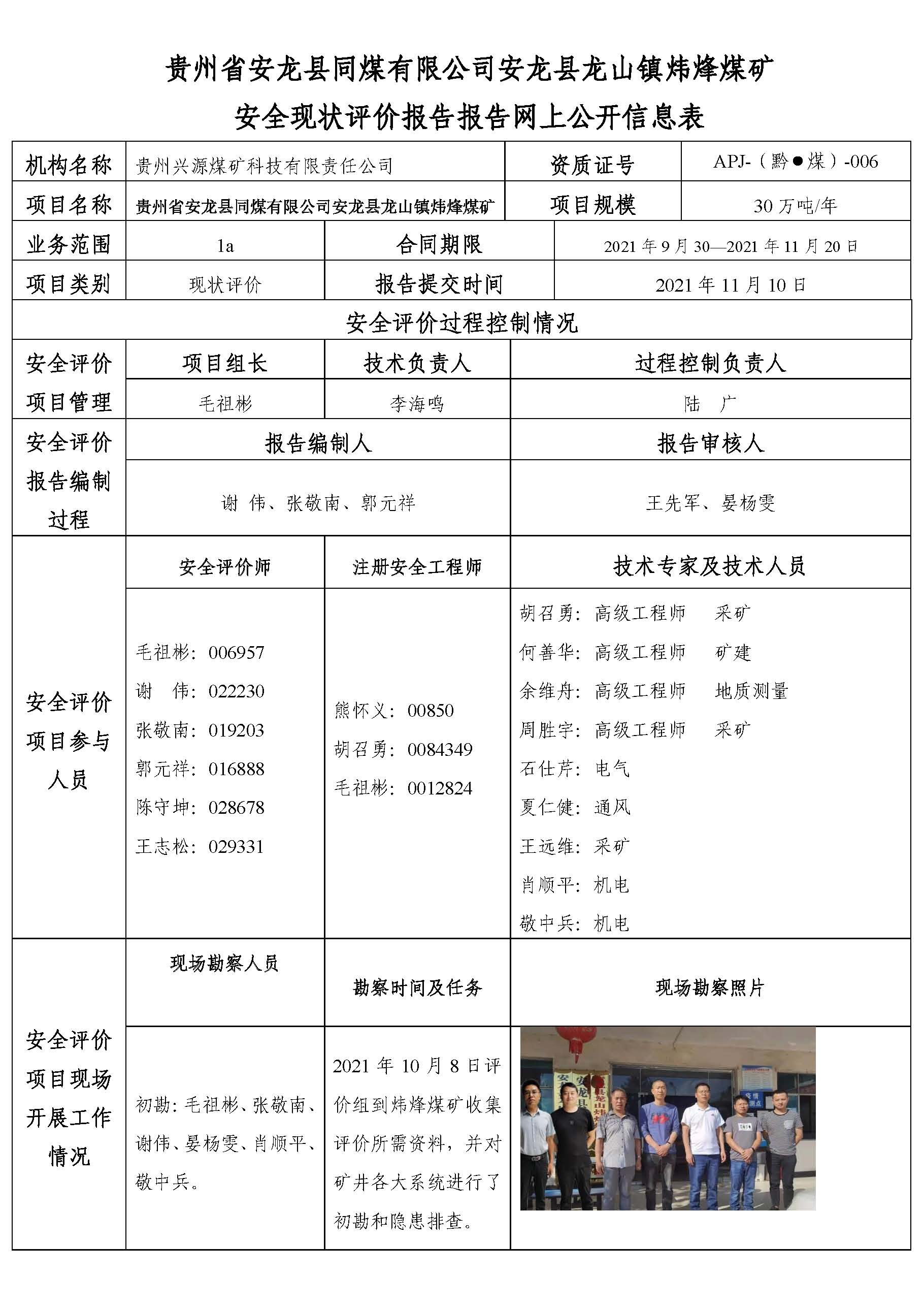 貴州省安龍縣同煤有限公司安龍縣龍山鎮(zhèn)煒?lè)槊旱V 安全現(xiàn)狀評(píng)價(jià)報(bào)告報(bào)告網(wǎng)上公開信息表