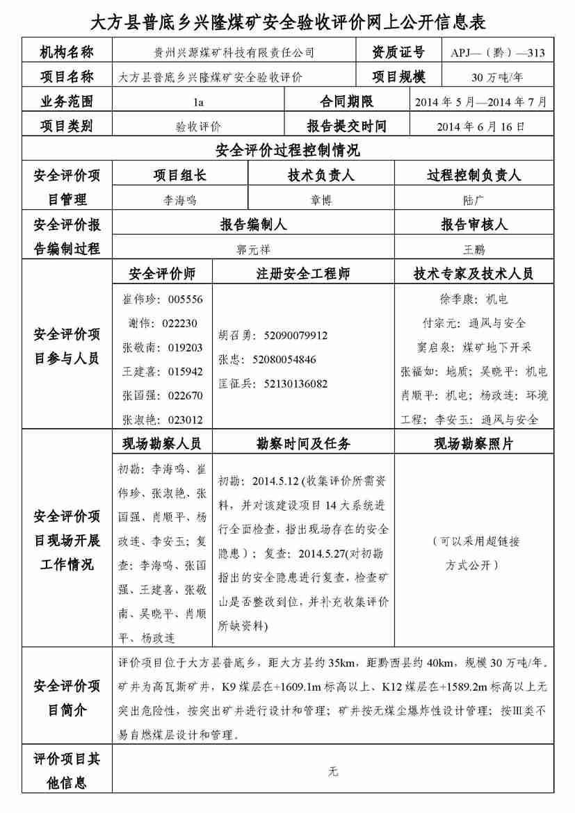 大方縣普底鄉(xiāng)興隆煤礦安全評(píng)價(jià)業(yè)務(wù)網(wǎng)上公開信息表