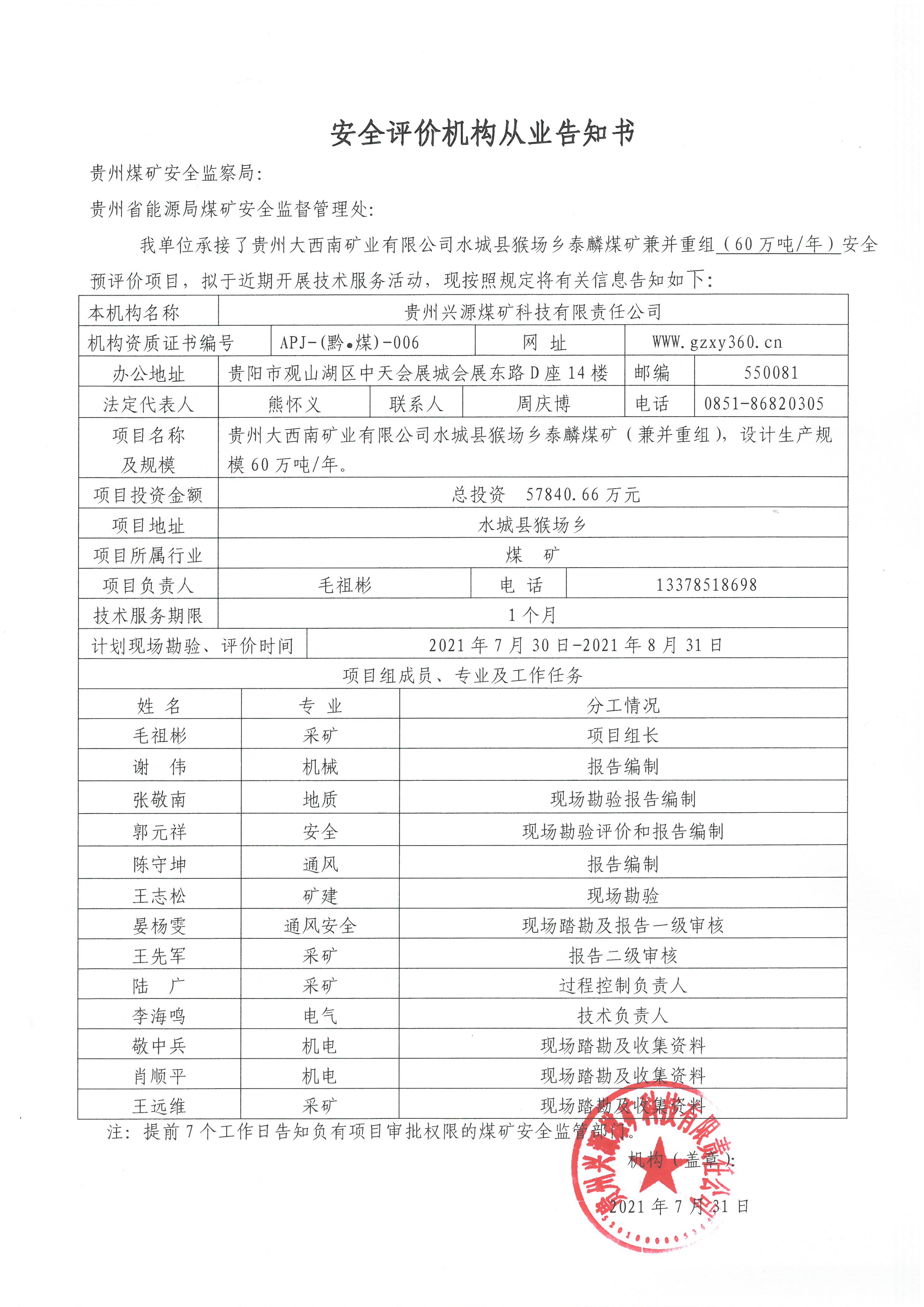 安全評價機構從業(yè)告知書(貴州大西南礦業(yè)有限公司水城縣猴場鄉(xiāng)泰麟煤礦兼并重組(60萬噸年)安全預評價)