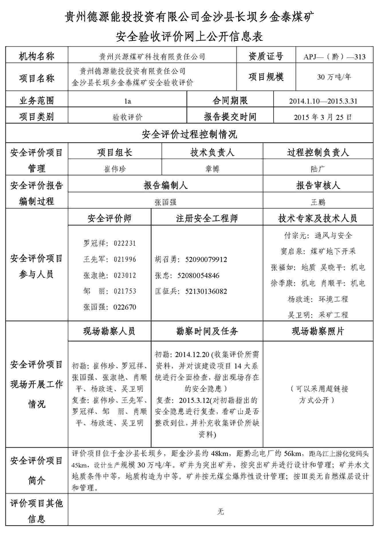 金沙縣長壩鄉(xiāng)金泰煤礦安全評價業(yè)務網(wǎng)上公開信息表