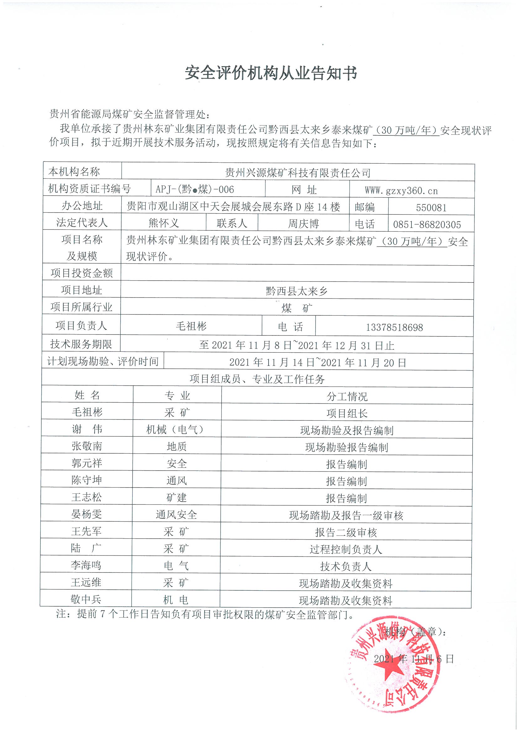 安全評(píng)價(jià)機(jī)構(gòu)從業(yè)告知書(貴州林東礦業(yè)集團(tuán)有限責(zé)任公司黔西縣太來鄉(xiāng)泰來煤礦(30萬噸/年)安全現(xiàn)狀評(píng)價(jià))
