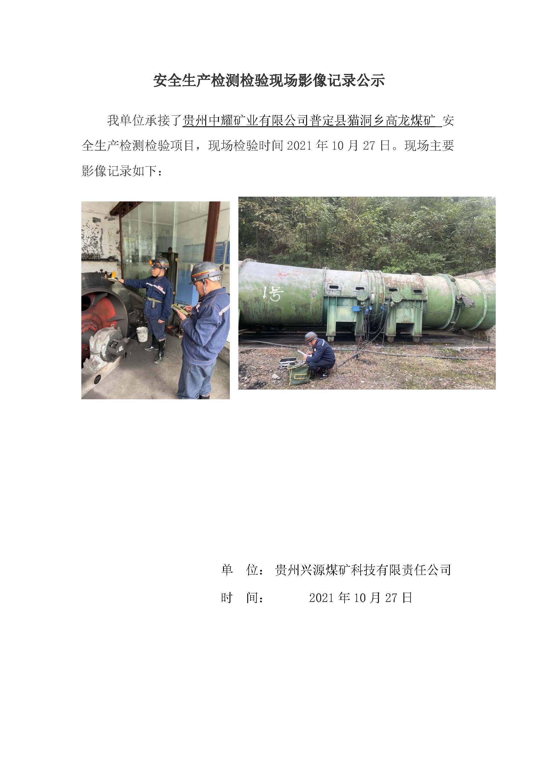 安全生產(chǎn)檢測檢驗現(xiàn)場影像記錄公示【貴州中耀礦業(yè)有限公司普定縣貓洞鄉(xiāng)高龍煤礦】