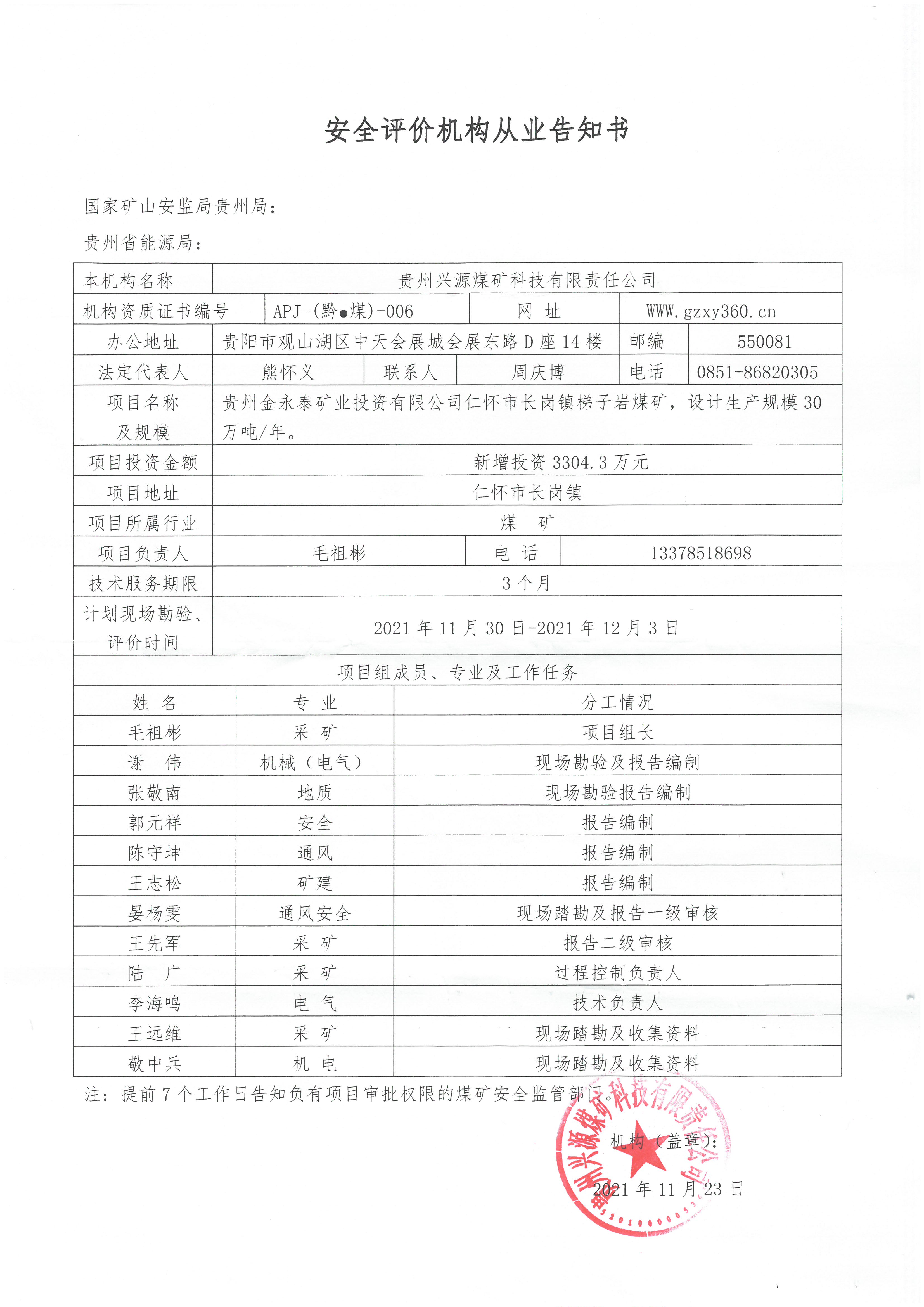 安全評(píng)價(jià)機(jī)構(gòu)從業(yè)告知書(shū)(貴州金永泰礦業(yè)投資有限公司仁懷市長(zhǎng)崗鎮(zhèn)梯子巖煤礦)