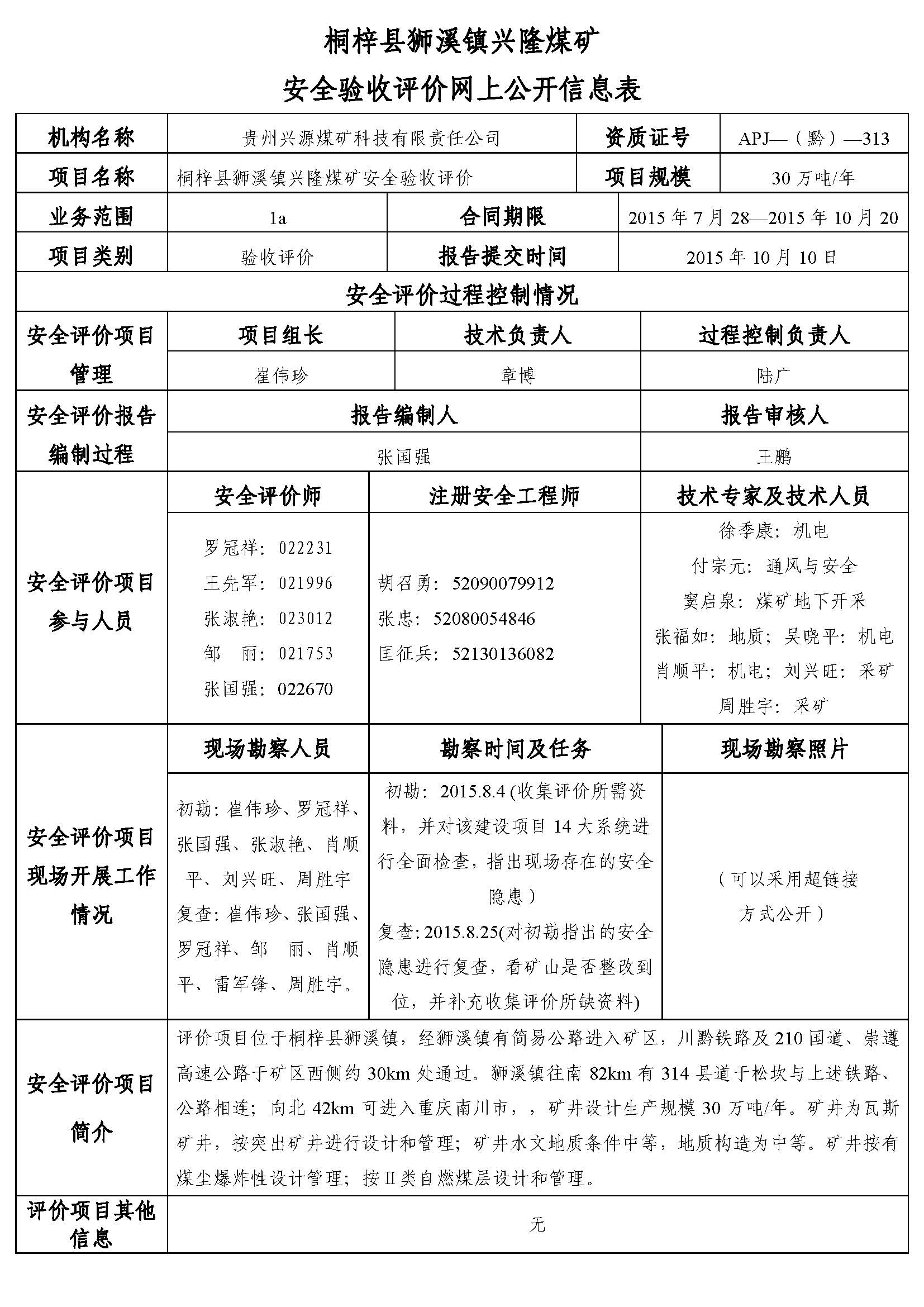 桐梓縣興隆煤礦安全評價業(yè)務網(wǎng)上公開信息表