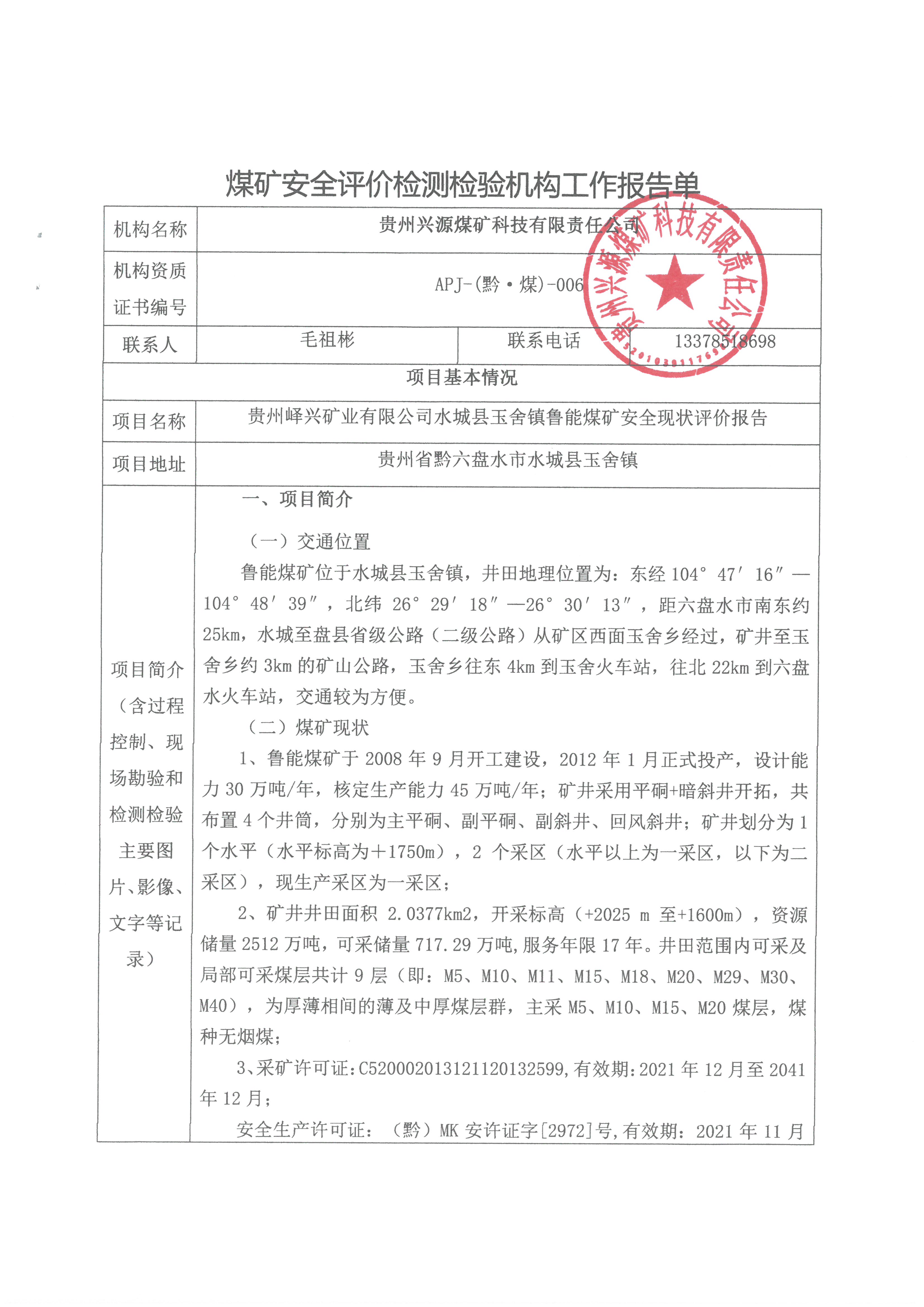 煤礦安全評價檢測檢驗機構(gòu)工作報告單【貴州嶧興礦業(yè)有限公司水城縣玉舍鎮(zhèn)魯能煤礦安全現(xiàn)狀評價報告】