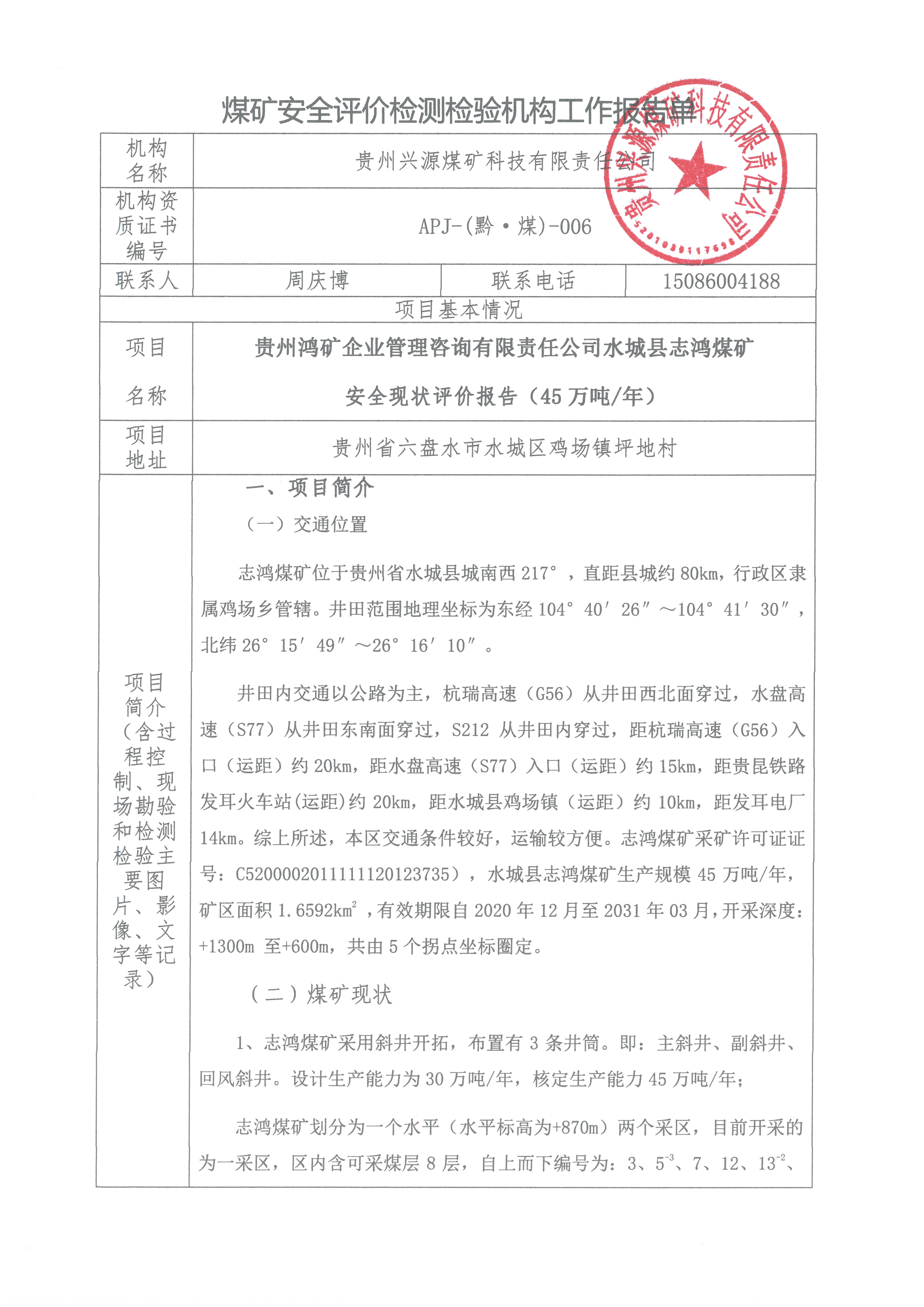 煤礦安全評價(jià)檢測檢驗(yàn)機(jī)構(gòu)工作報(bào)告單[貴州鴻礦企業(yè)管理咨詢有限責(zé)任公司水城縣志鴻煤礦 安全現(xiàn)狀評價(jià)報(bào)告(45萬噸/年)]