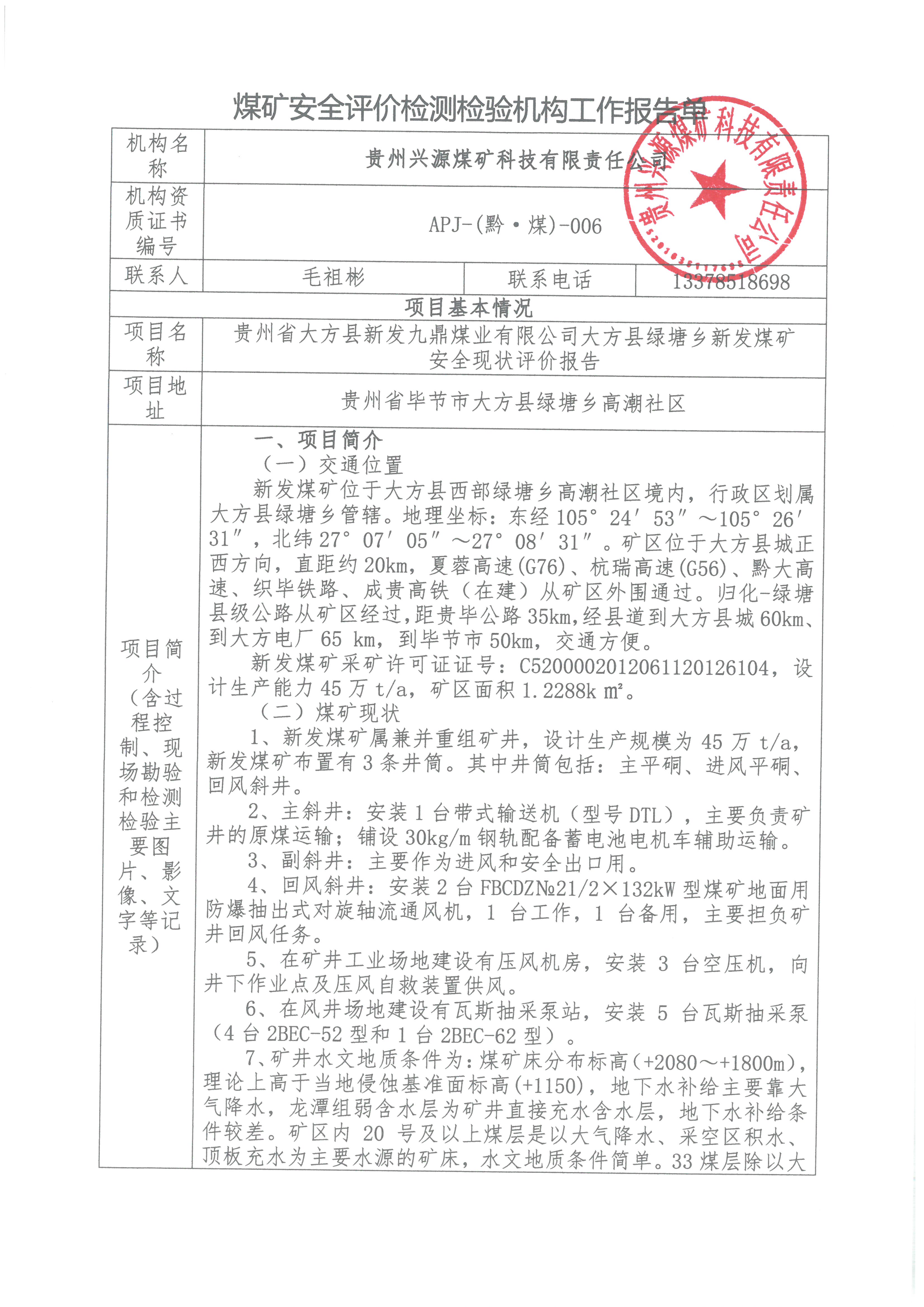 煤礦安全評價檢測檢驗機構工作報告單【貴州省大方縣新發(fā)九鼎煤業(yè)有限公司大方縣綠塘鄉(xiāng)新發(fā)煤礦 安全現(xiàn)狀評價報告】