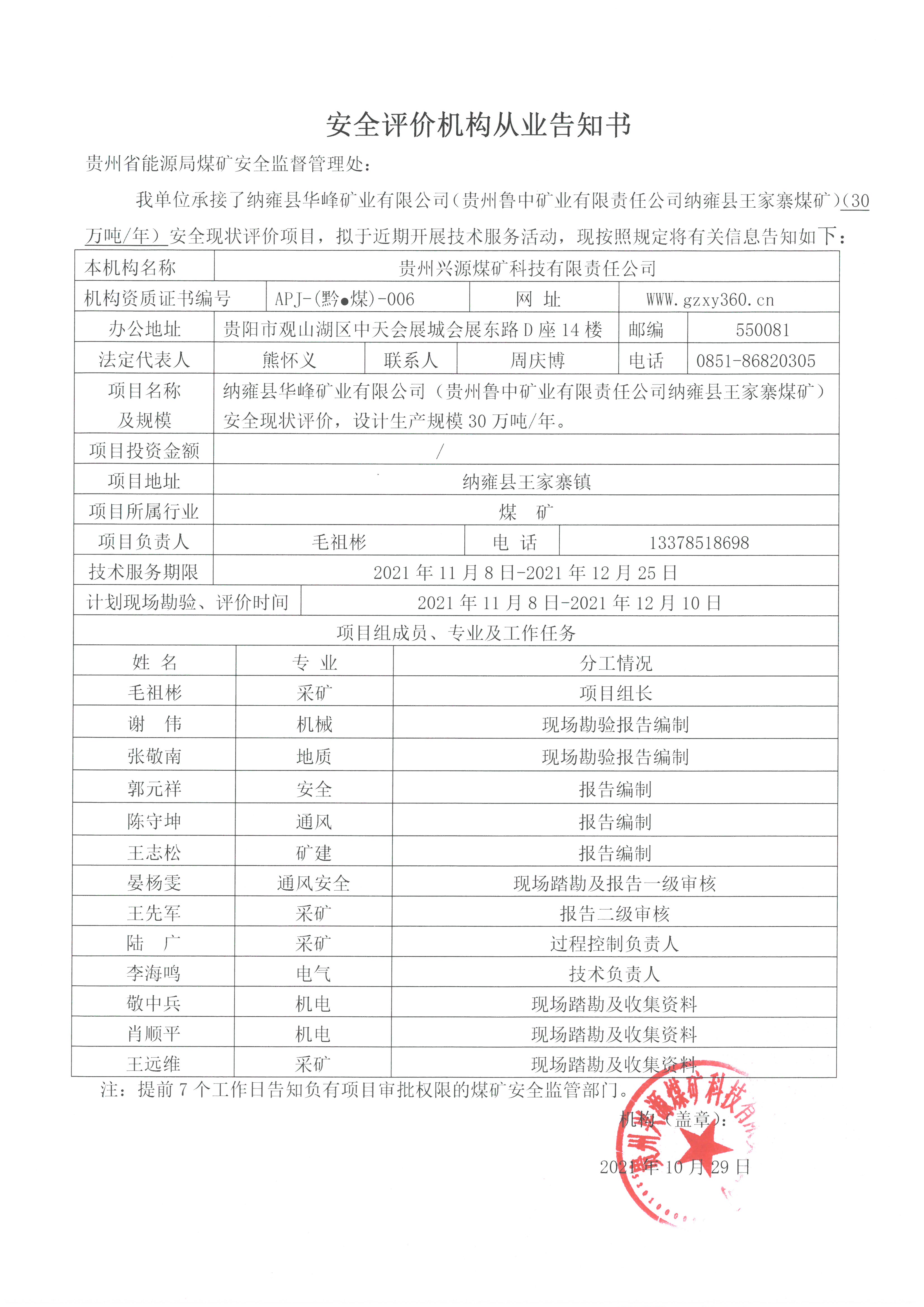 安全評價機(jī)構(gòu)從業(yè)告知書(納雍縣華峰礦業(yè)有限公司(貴州魯中礦業(yè)有限責(zé)任公司納雍縣王家寨煤礦)(30萬噸年)安全現(xiàn)狀評價)