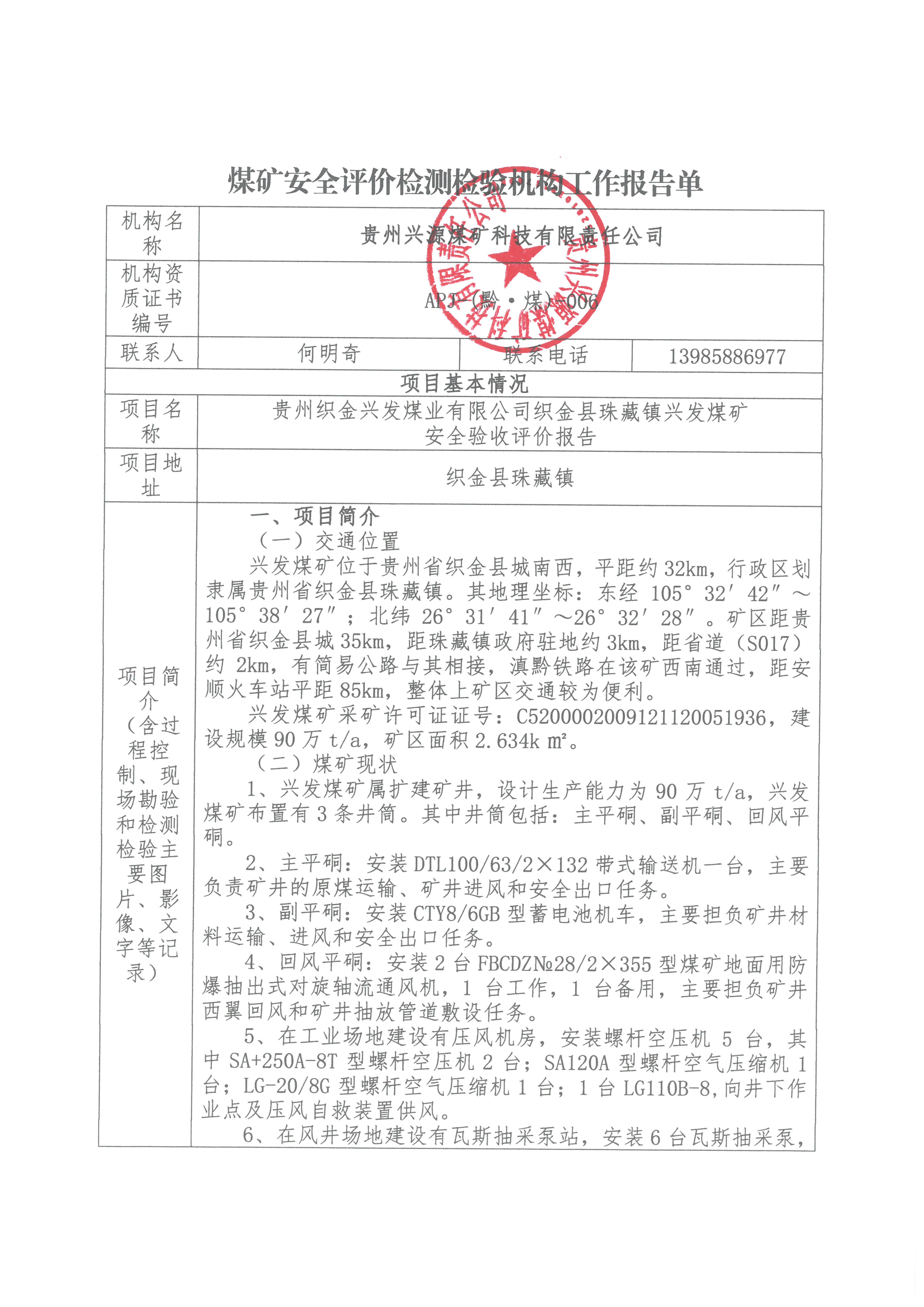 煤礦安全評(píng)價(jià)檢測(cè)檢驗(yàn)機(jī)構(gòu)工作報(bào)告單【貴州織金興發(fā)煤業(yè)有限公司織金縣珠藏鎮(zhèn)興發(fā)煤礦安全驗(yàn)收評(píng)價(jià)報(bào)告】
