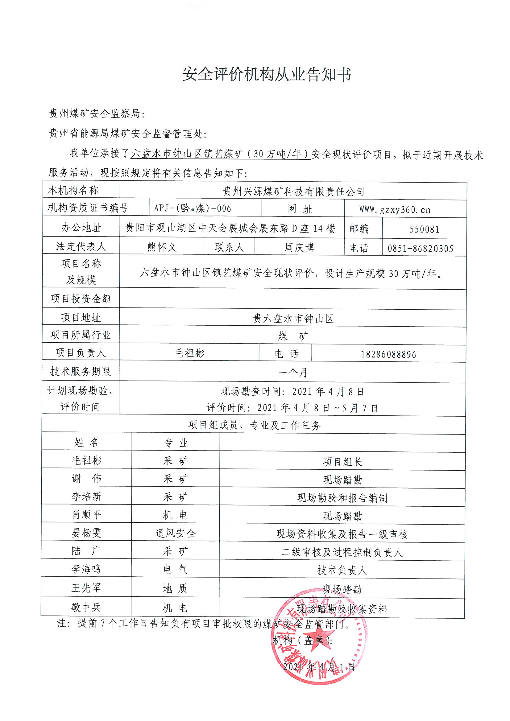安全評(píng)價(jià)機(jī)構(gòu)從業(yè)告知書(六盤水市鐘山區(qū)鎮(zhèn)藝煤礦(30萬噸年))