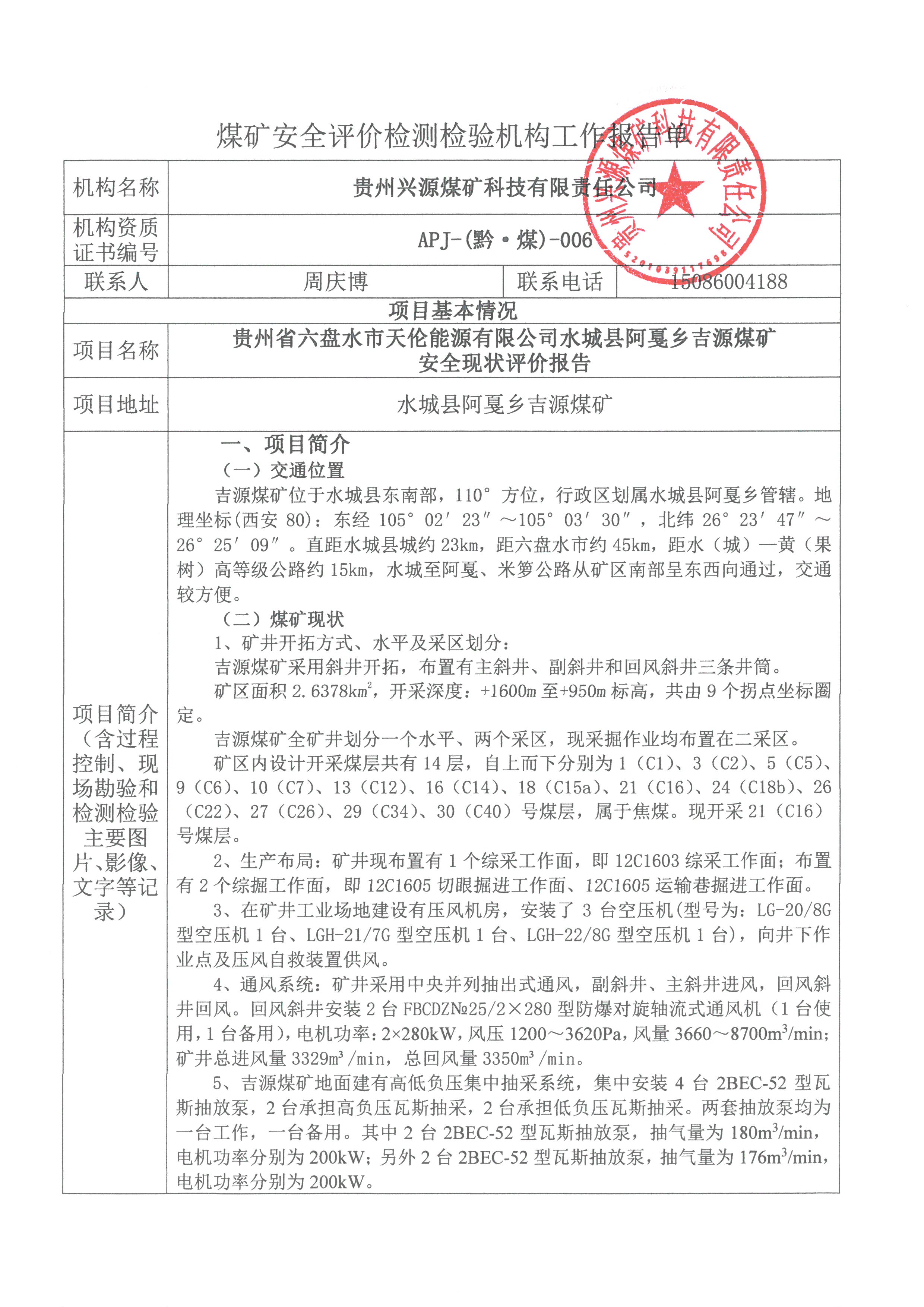 煤礦安全評(píng)價(jià)檢測檢驗(yàn)機(jī)構(gòu)工作報(bào)告單(貴州省六盤水市天倫能源有限公司水城縣阿戛鄉(xiāng)吉源煤礦安全現(xiàn)狀評(píng)價(jià)報(bào)告)