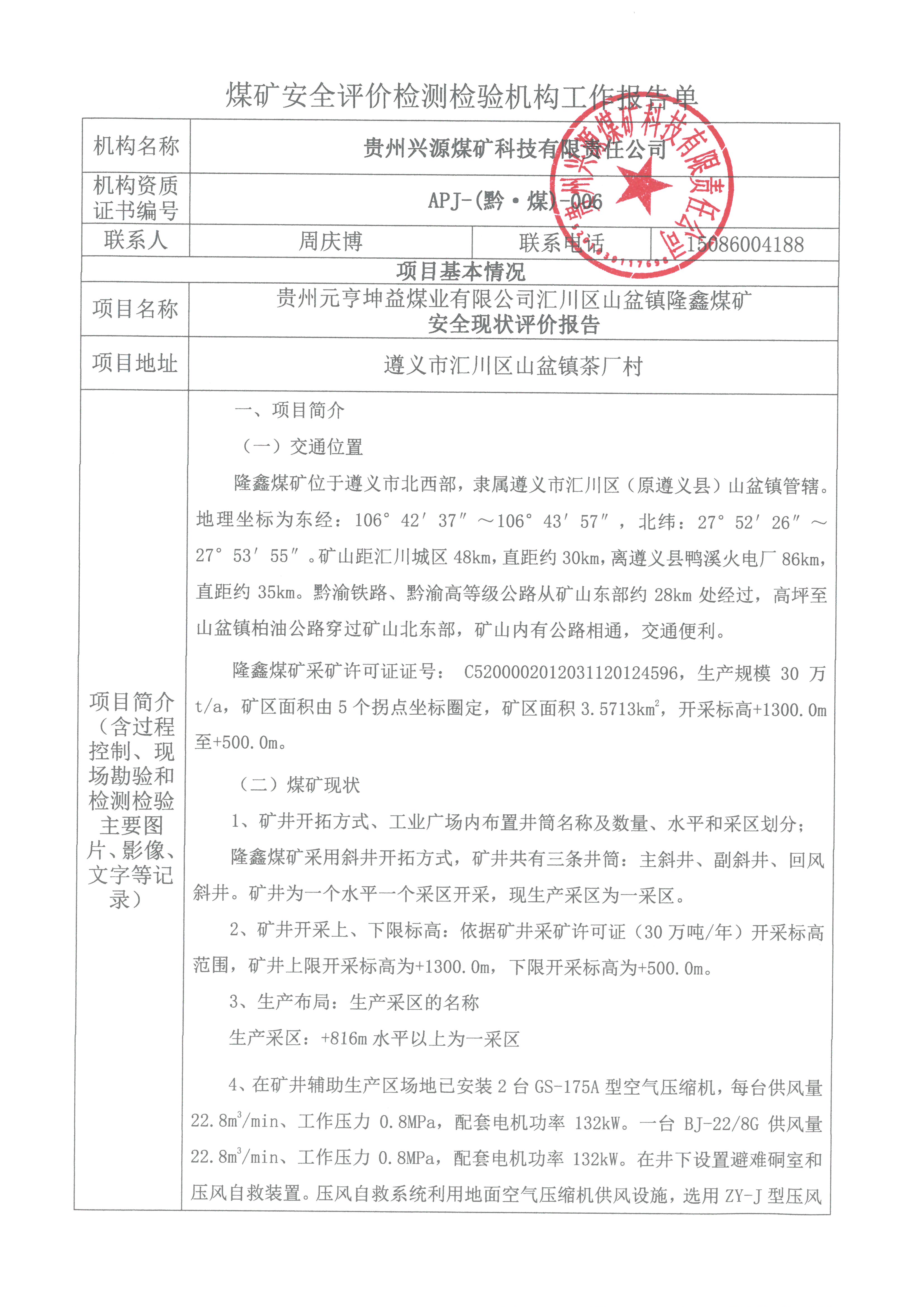 煤礦安全評價檢測檢驗機構(gòu)工作報告單【貴州元亨坤益煤業(yè)有限公司匯川區(qū)山盆鎮(zhèn)隆鑫煤礦安全現(xiàn)狀評價報告】