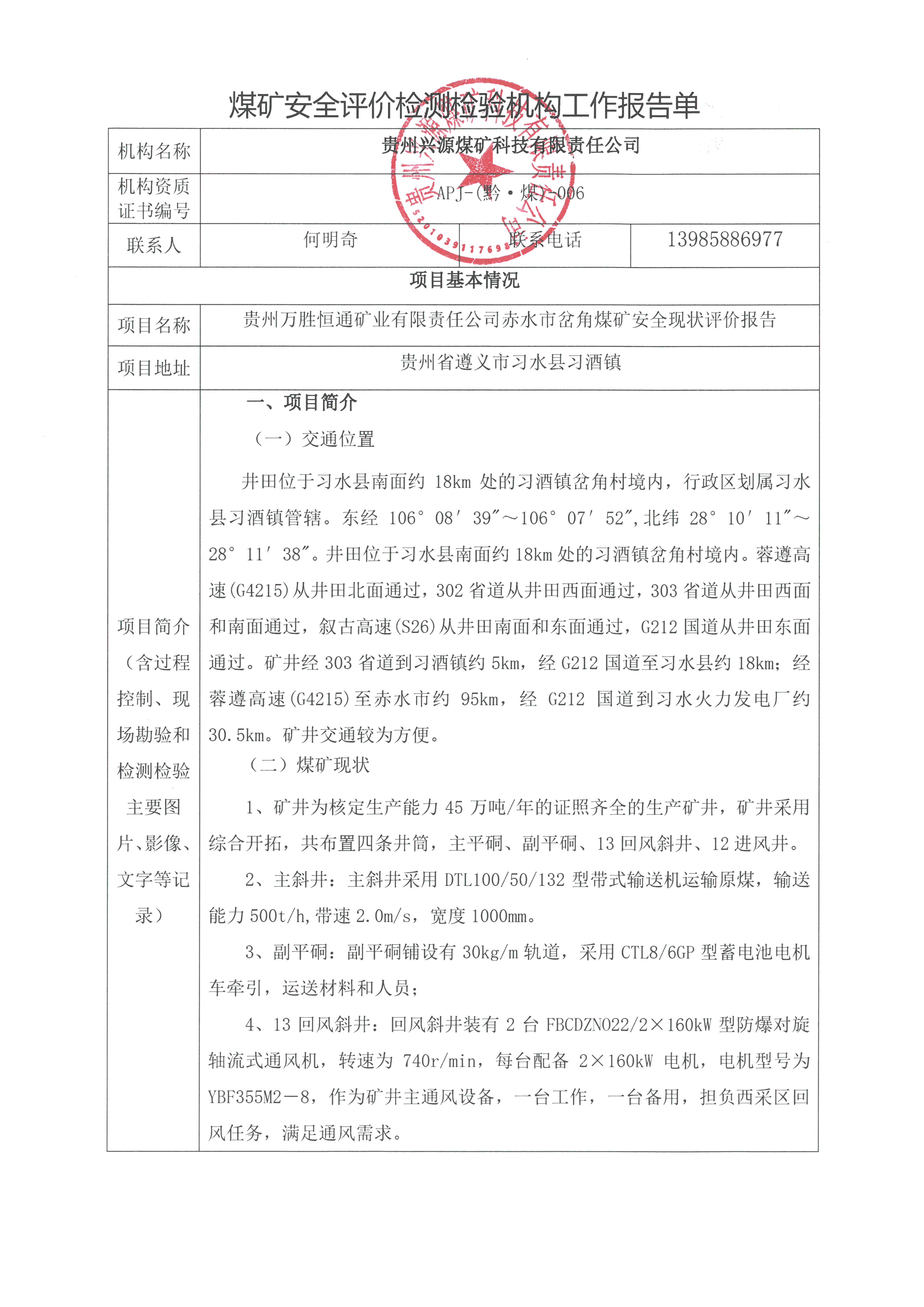 煤礦安全評價檢測檢驗機構(gòu)工作報告單【貴州萬勝恒通礦業(yè)有限責任公司赤水市岔角煤礦安全現(xiàn)狀評價報告】