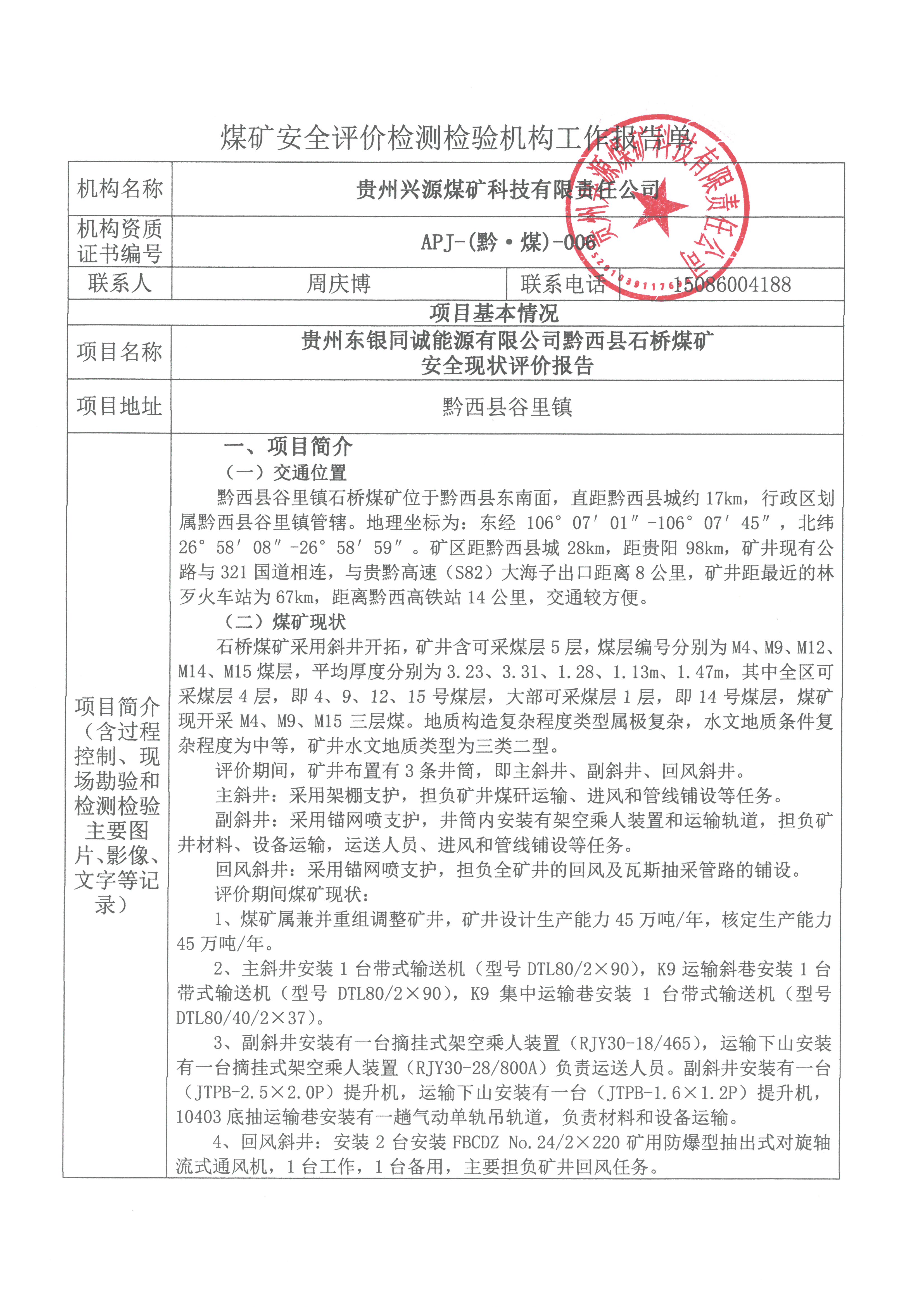 煤礦安全評價檢測檢驗機構工作報告單【貴州東銀同誠能源有限公司黔西縣石橋煤礦安全現(xiàn)狀評價報告】
