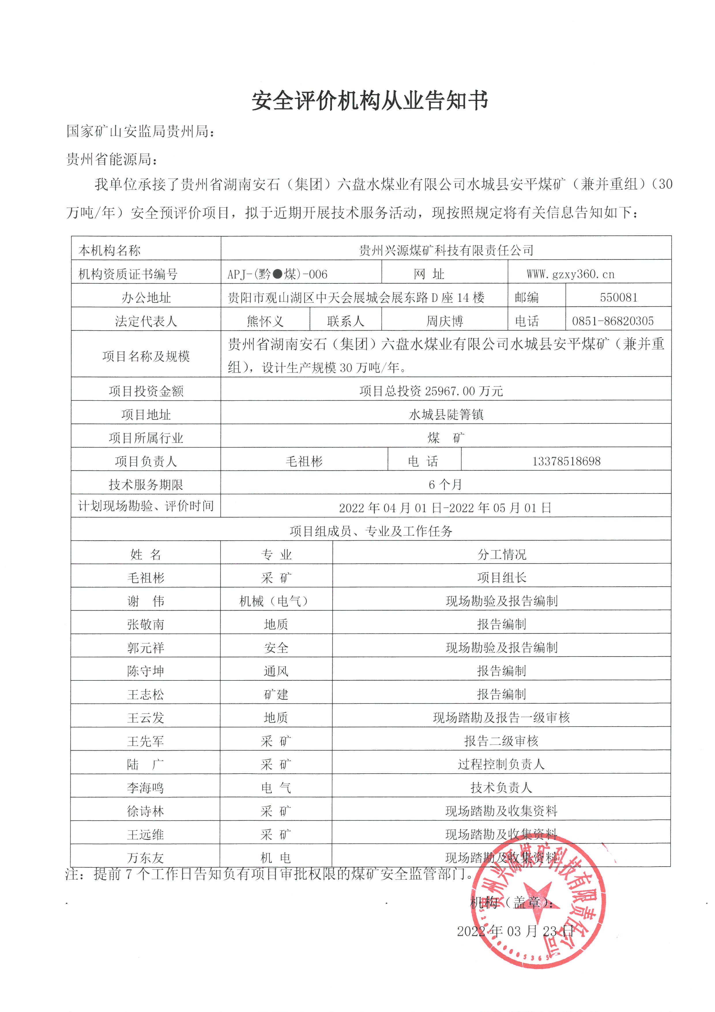安全評價機構從業(yè)告知書【貴州省湖南安石(集團)六盤水煤業(yè)有限公司水城縣安平煤礦(兼并重組)(30萬噸/年)安全預評價】