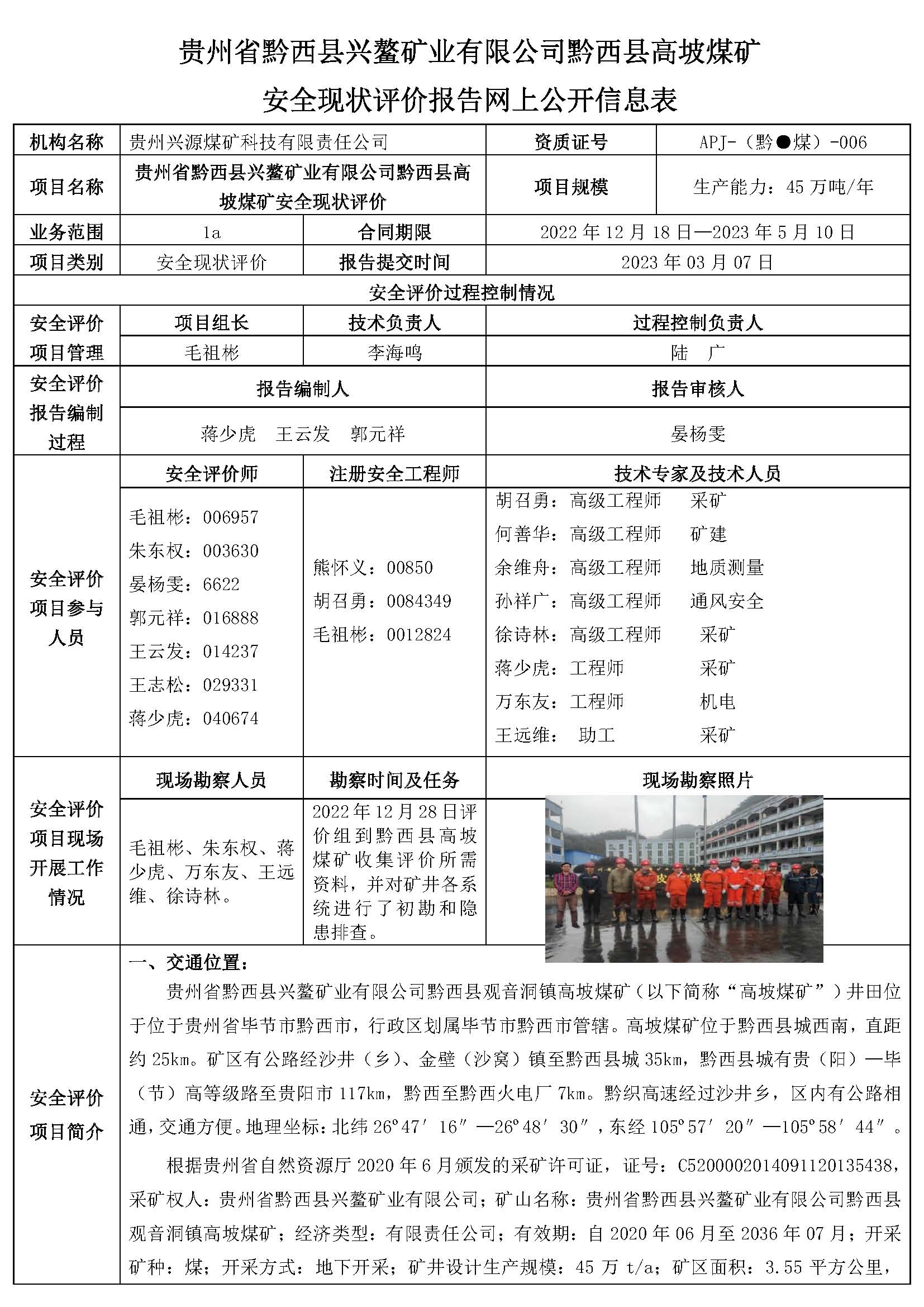 貴州省黔西縣興鰲礦業(yè)有限公司黔西縣高坡煤礦安全現(xiàn)狀評價(jià)報(bào)告網(wǎng)上公開信息表
