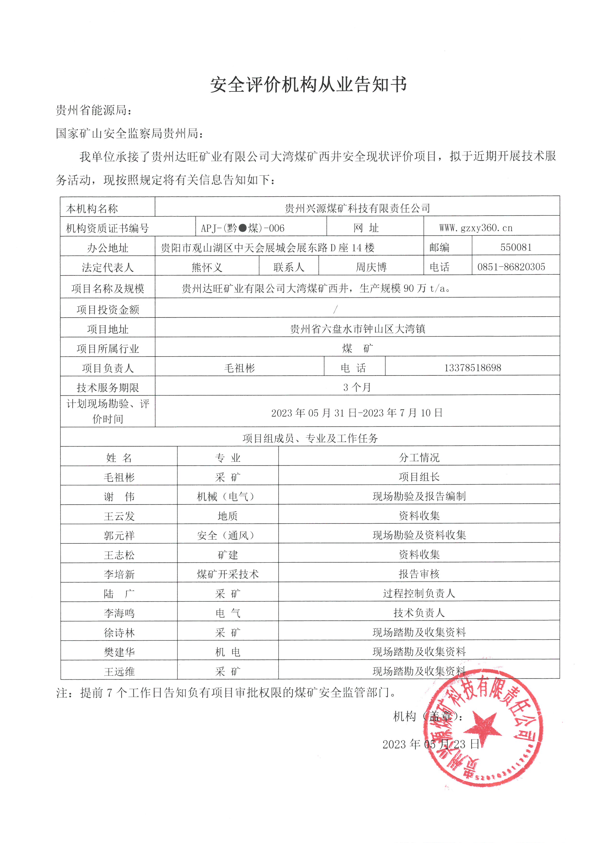 安全評價機構(gòu)從業(yè)告知書【貴州達旺礦業(yè)有限公司大灣煤礦西井安全現(xiàn)狀評價】