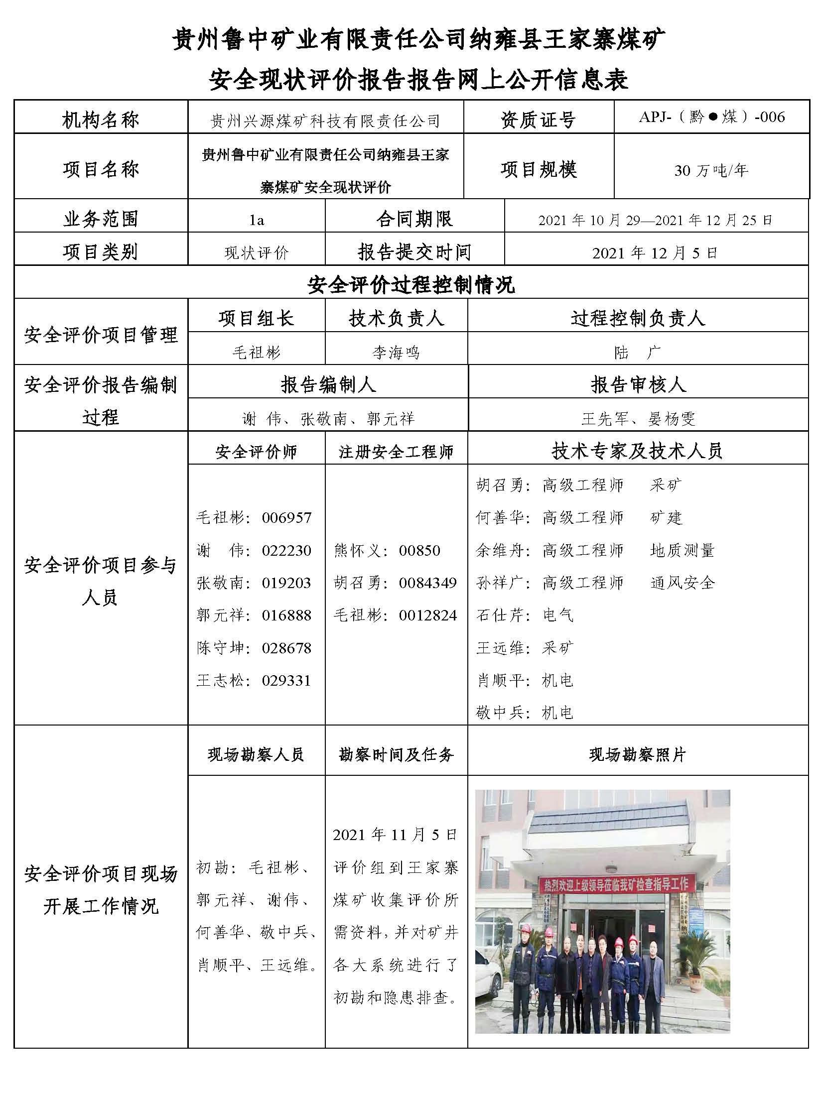 貴州魯中礦業(yè)有限責(zé)任公司納雍縣王家寨煤礦 安全現(xiàn)狀評價報告報告網(wǎng)上公開信息表