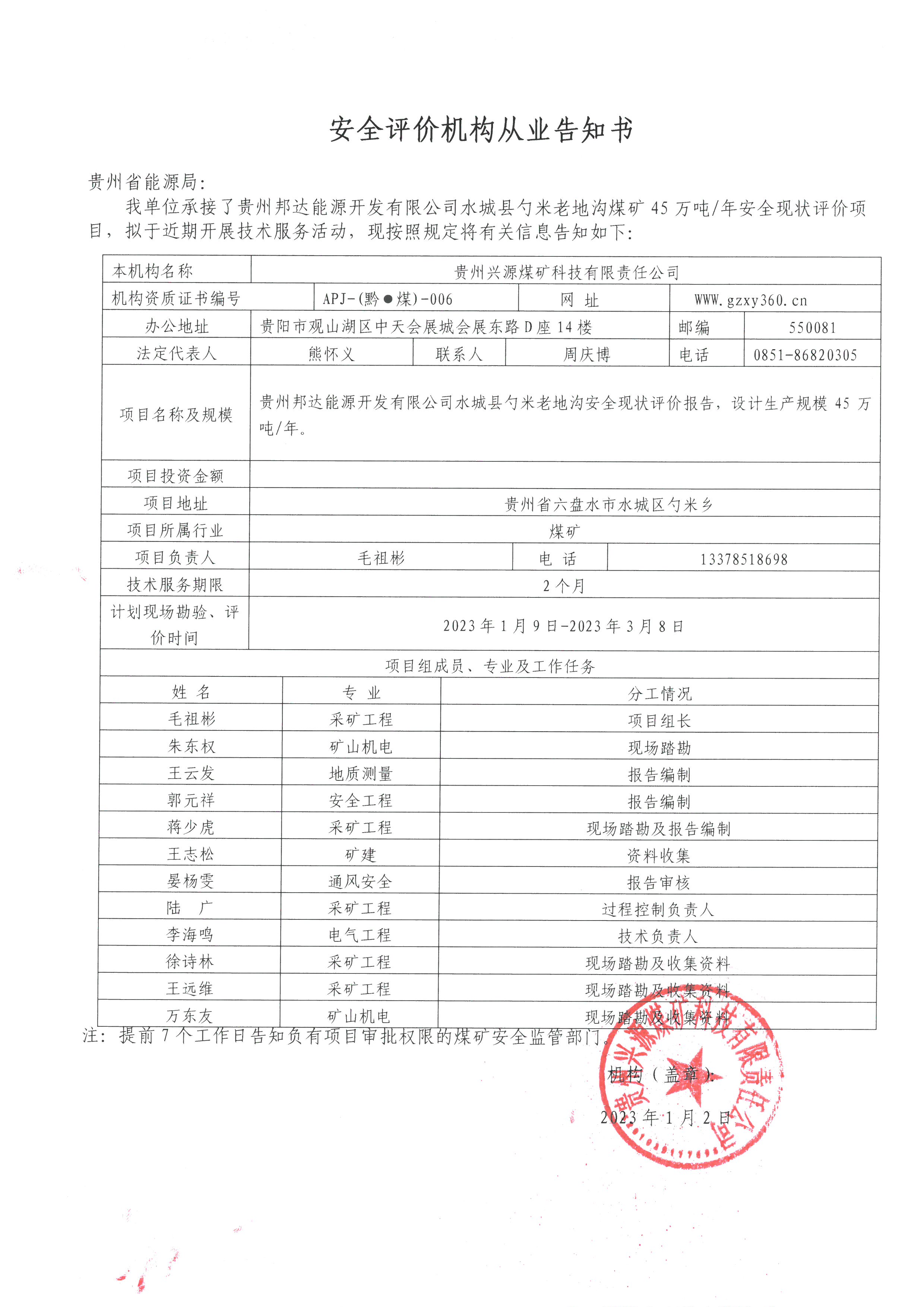 安全評價機構(gòu)從業(yè)告知書【貴州邦達能源開發(fā)有限公司水城縣勺米老地溝煤礦】