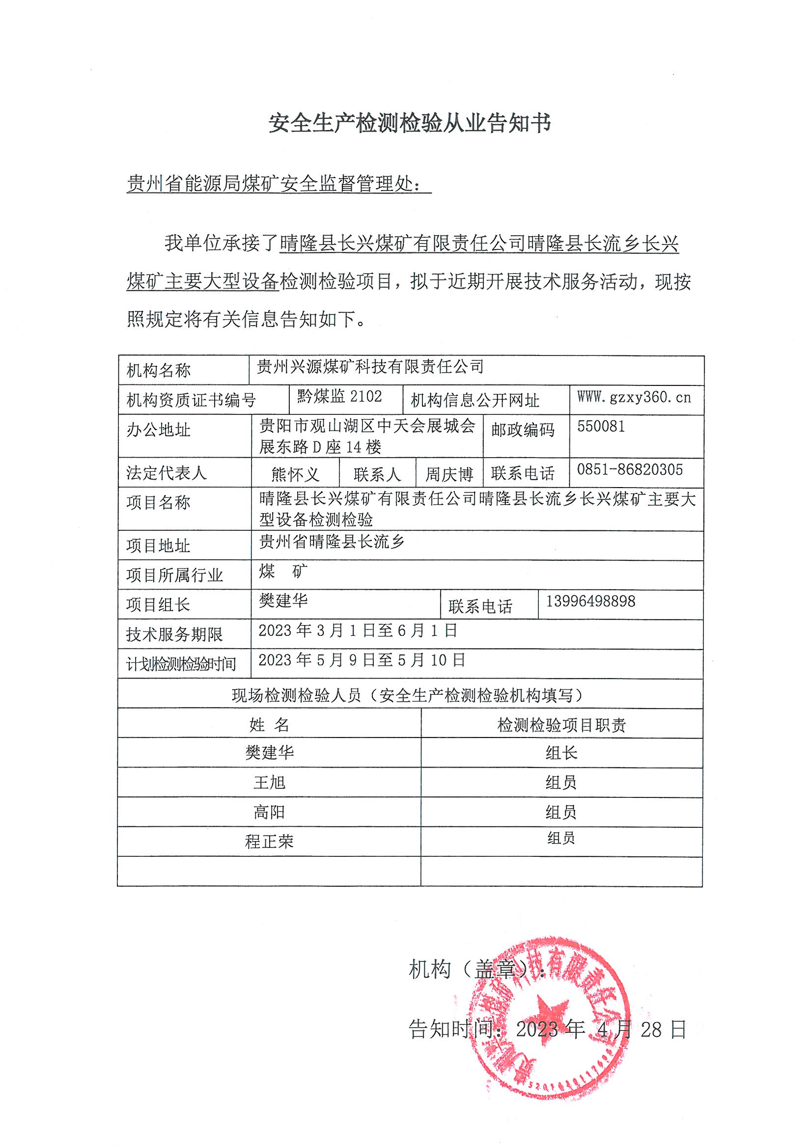 安全生產(chǎn)檢測檢驗從業(yè)告知書【晴隆縣長興煤礦有限責(zé)任公司晴隆縣長流鄉(xiāng)長興煤礦】