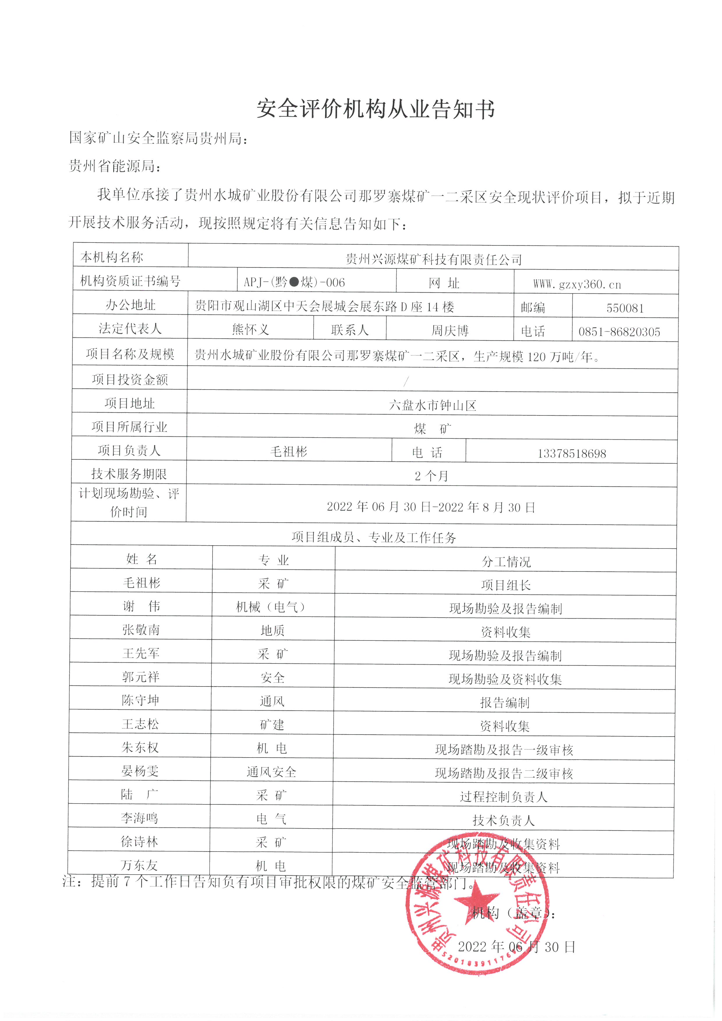 安全評(píng)價(jià)機(jī)構(gòu)從業(yè)告知書【貴州水城礦業(yè)股份有限公司那羅寨煤礦】