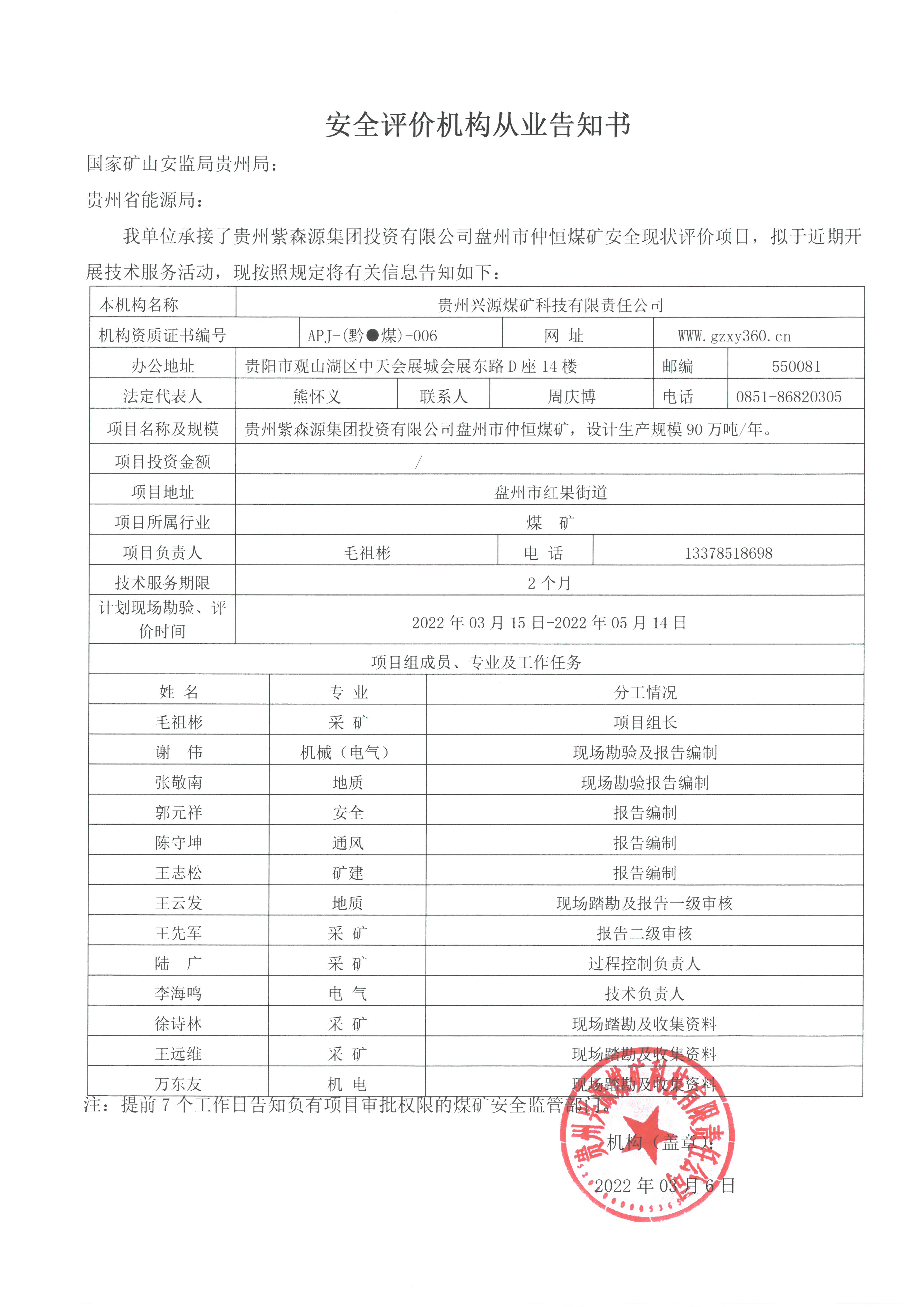 安全評價機構(gòu)從業(yè)告知書(貴州紫森源集團投資有限公司盤州市仲恒煤礦安全現(xiàn)狀評價)