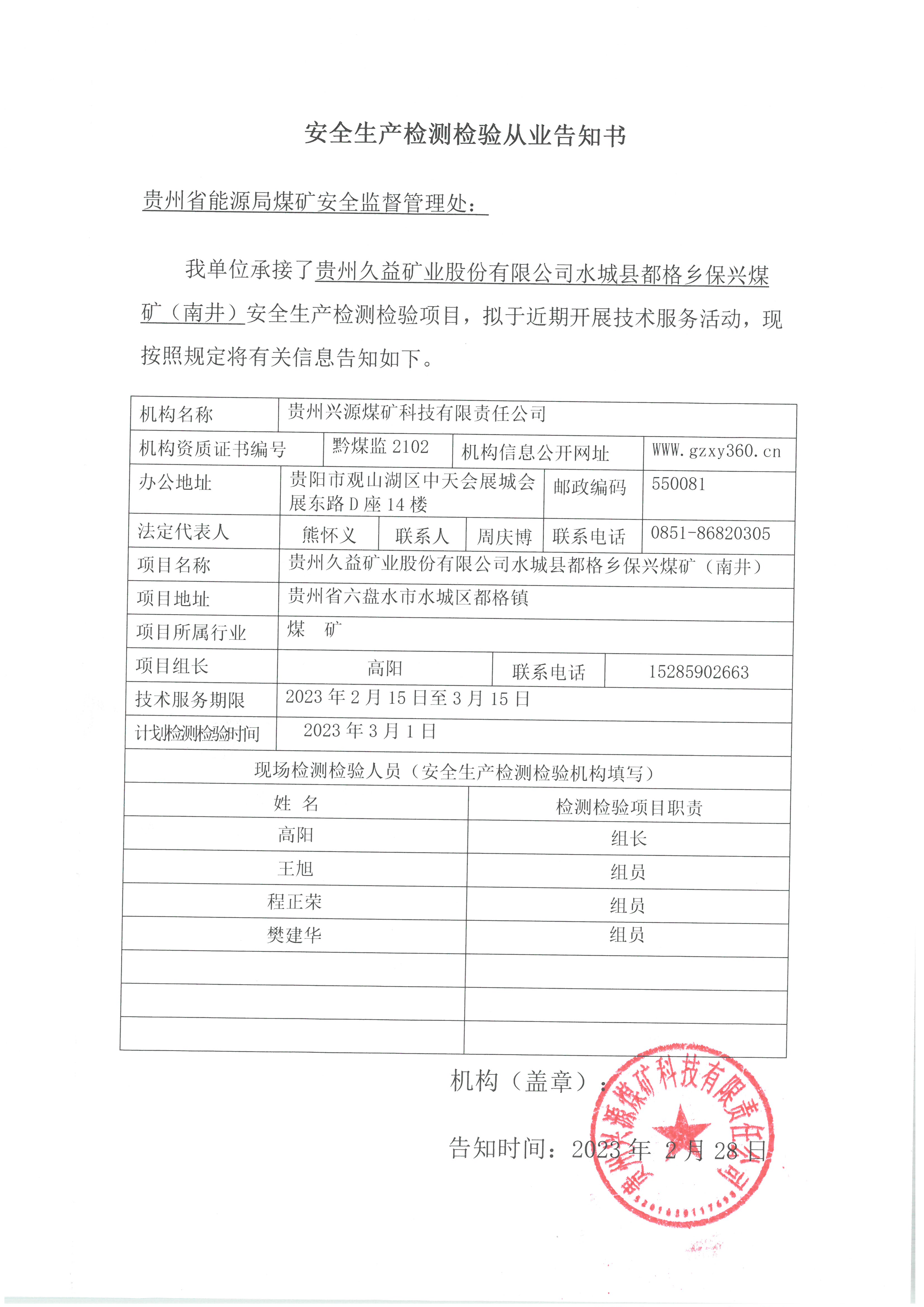 安全生產(chǎn)檢測檢驗從業(yè)告知書【貴州久益礦業(yè)股份有限公司水城縣都格鄉(xiāng)保興煤礦(南井)】