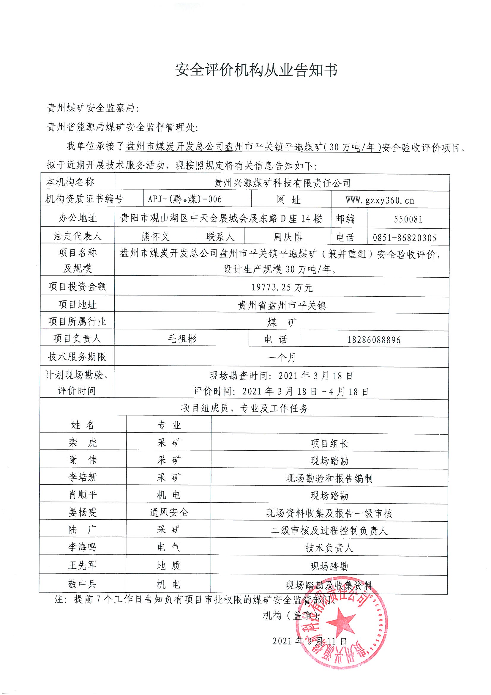 安全評(píng)價(jià)機(jī)構(gòu)從業(yè)告知書(shū)(盤(pán)州市煤炭開(kāi)發(fā)總公司盤(pán)州市平關(guān)鎮(zhèn)平迤煤礦(30萬(wàn)噸年)安全驗(yàn)收評(píng)價(jià))