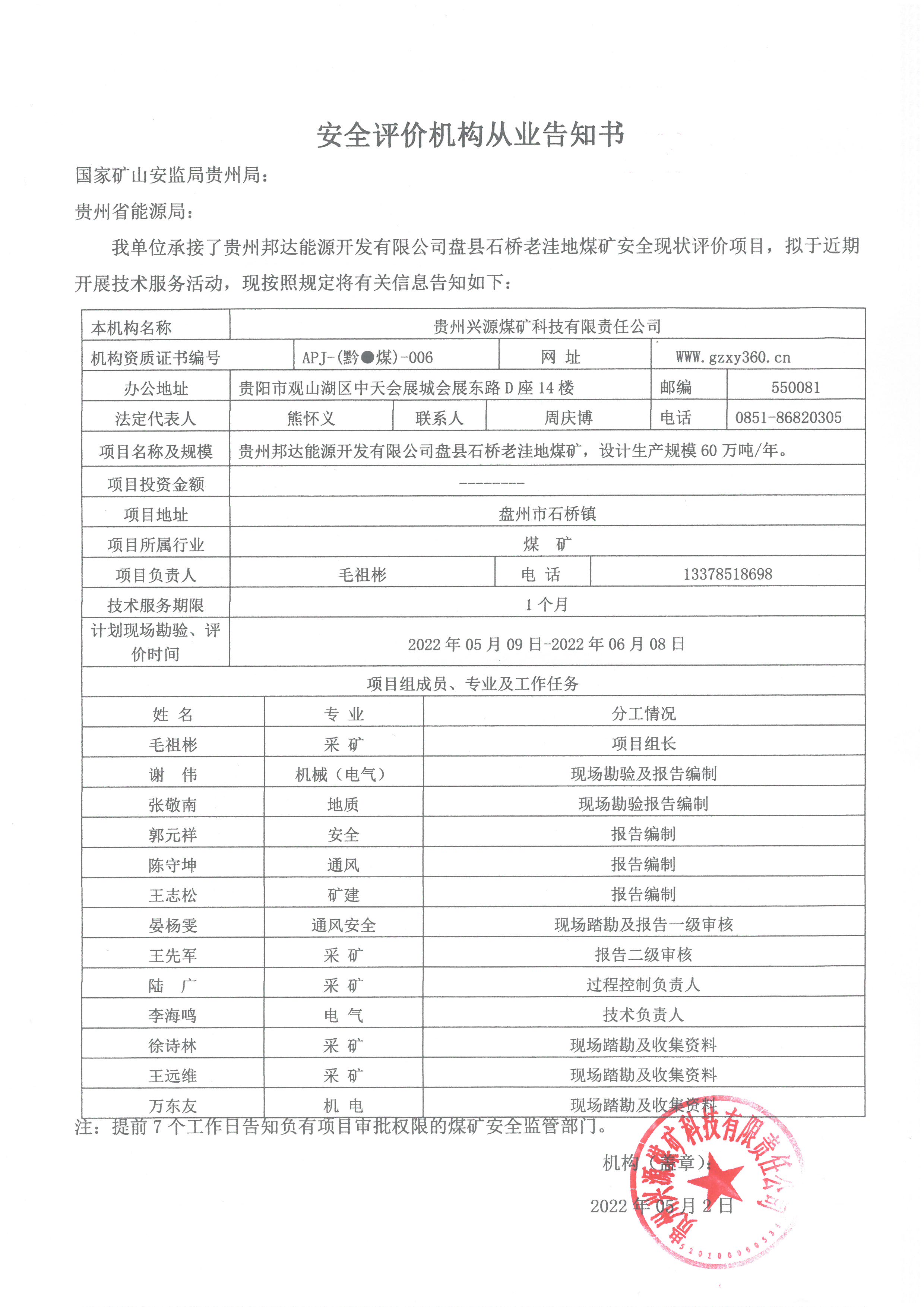 安全評(píng)價(jià)機(jī)構(gòu)從業(yè)告知書(貴州邦達(dá)能源開發(fā)有限公司盤縣石橋老洼地煤礦)
