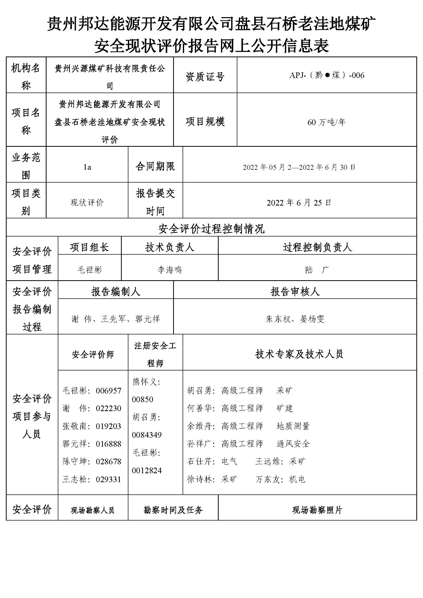 貴州邦達(dá)能源開發(fā)有限公司盤縣石橋老洼地煤礦 安全現(xiàn)狀評(píng)價(jià)報(bào)告網(wǎng)上公開信息表