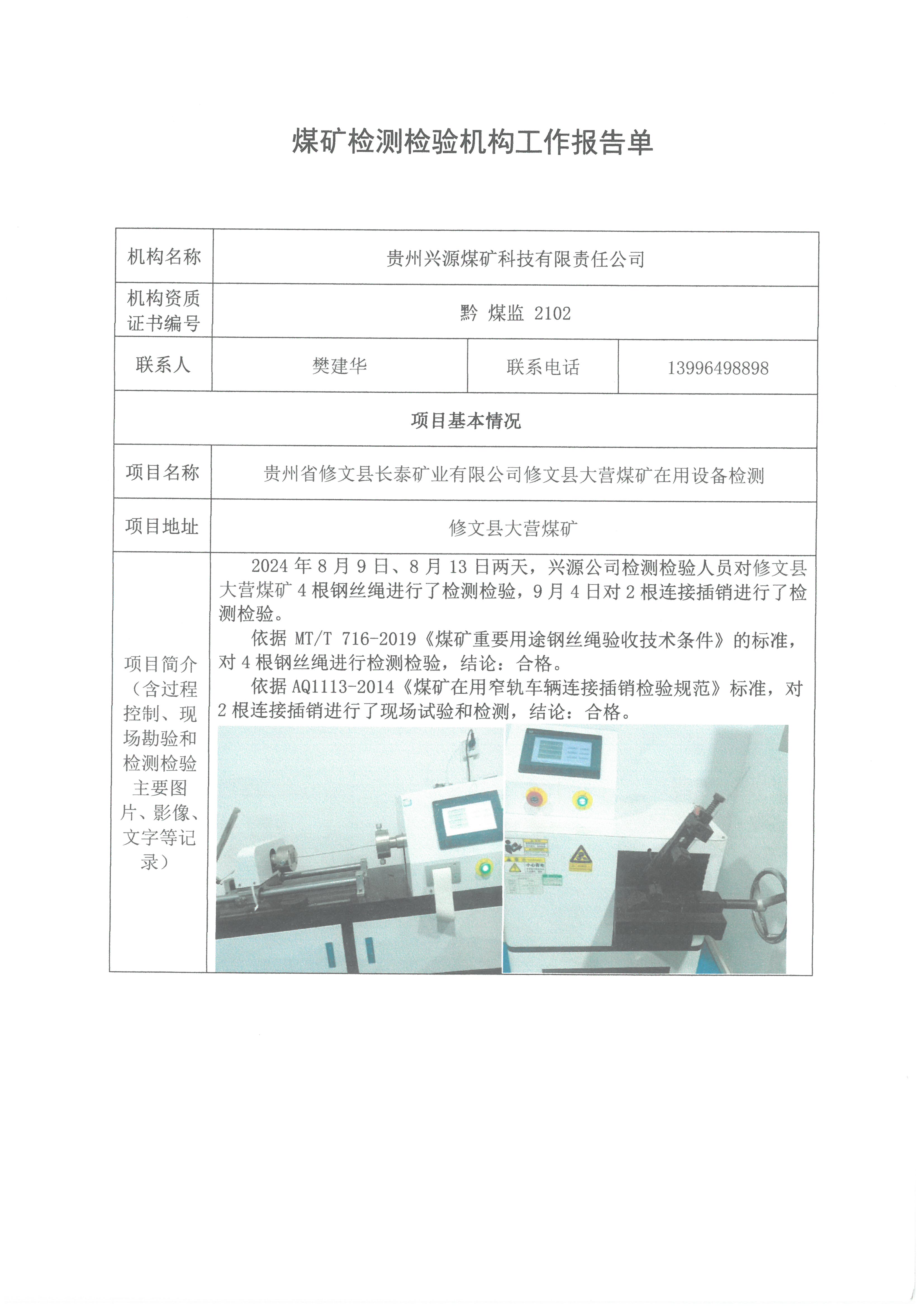 煤礦檢測(cè)檢驗(yàn)機(jī)構(gòu)工作報(bào)告單【貴州省修文縣長(zhǎng)泰礦業(yè)有限公司修文縣大營(yíng)煤礦在用設(shè)備檢測(cè)】
