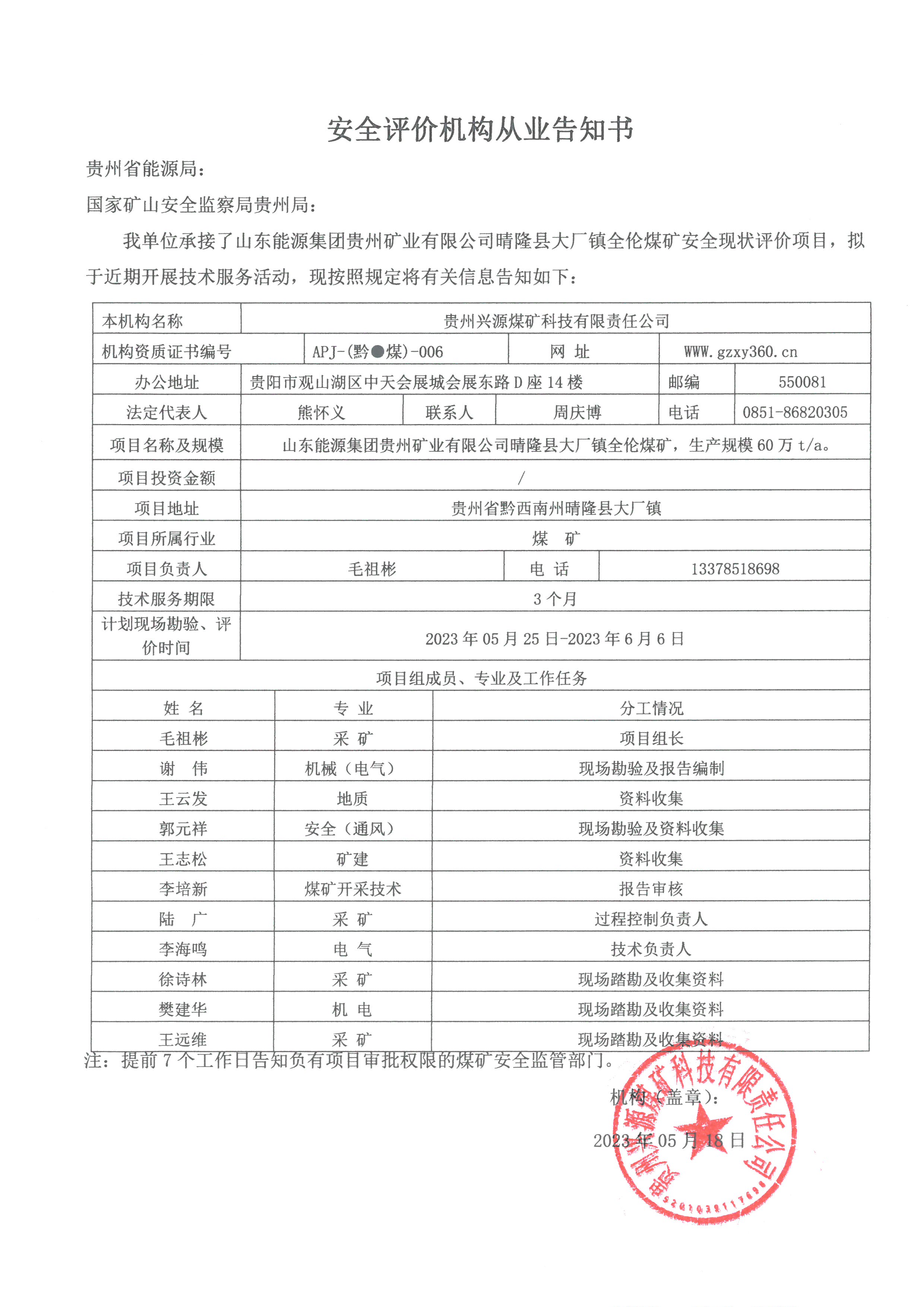 安全評價機構從業(yè)告知書【山東能源集團貴州礦業(yè)有限公司晴隆縣大廠鎮(zhèn)全倫煤礦安全現(xiàn)狀評價項目】