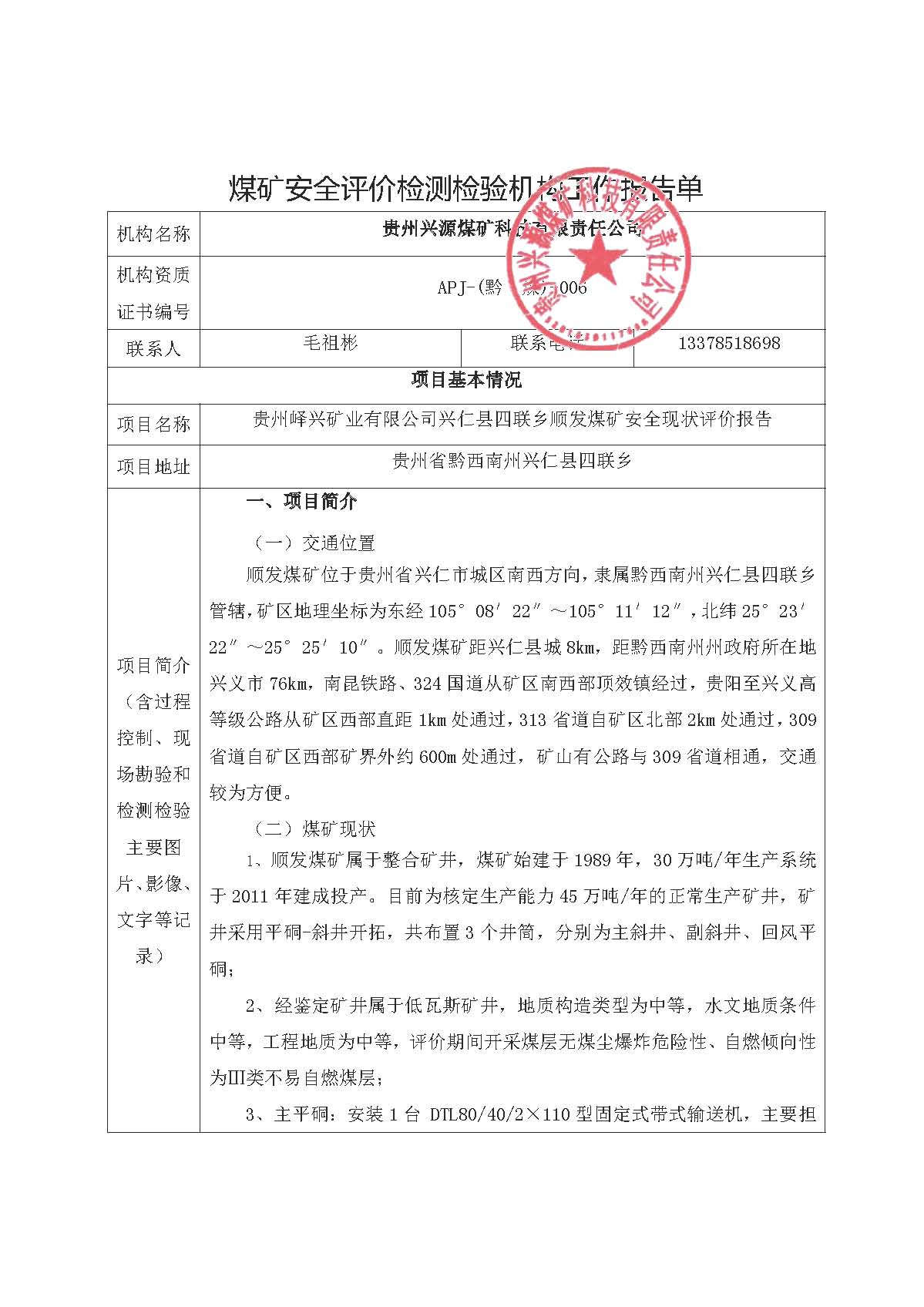 煤礦安全評價檢測檢驗機構工作報告單【貴州嶧興礦業(yè)有限公司興仁縣四聯(lián)鄉(xiāng)順發(fā)煤礦安全現(xiàn)狀評價報告】