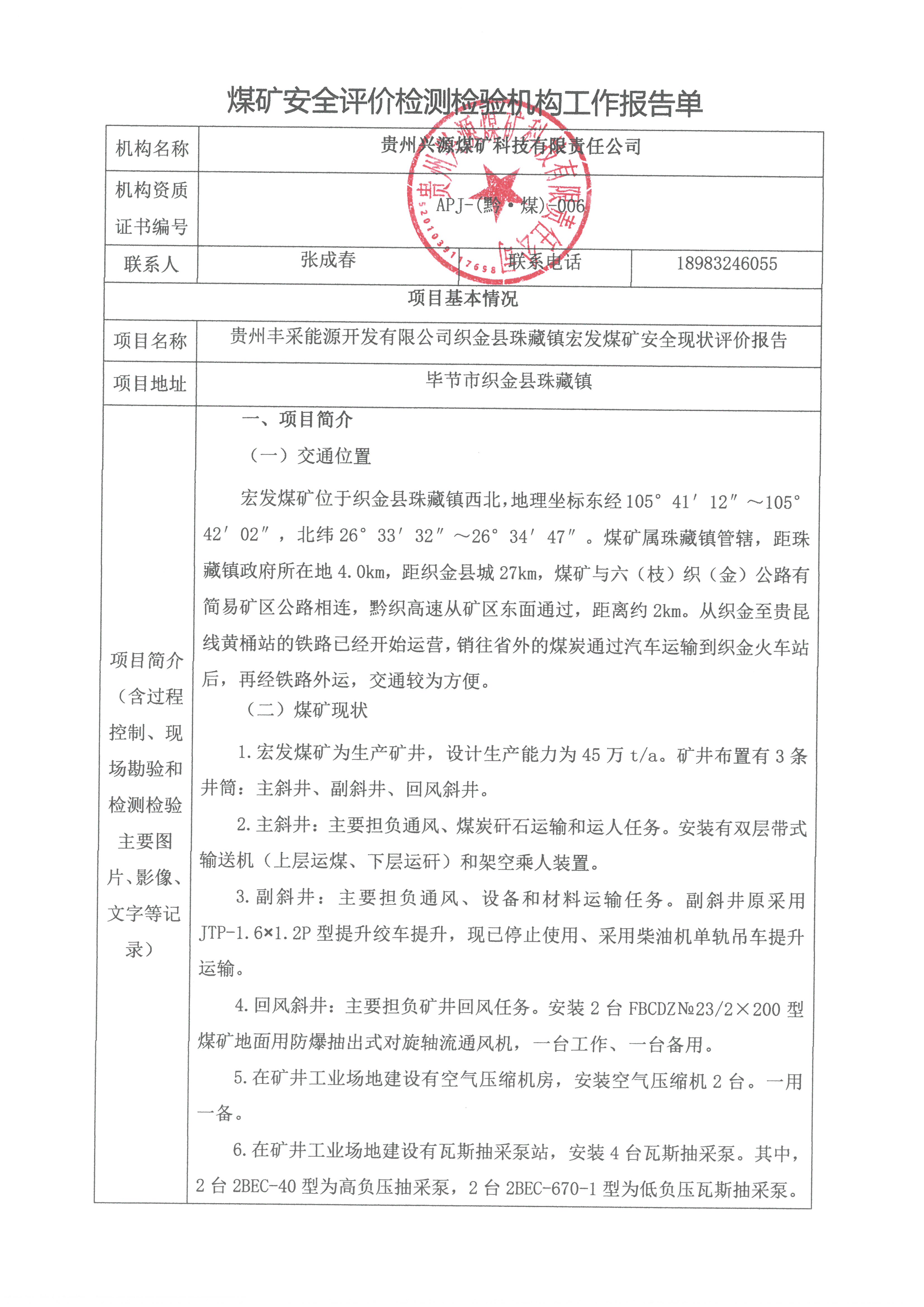 煤礦安全評價檢測檢驗機構工作報告單【貴州豐采能源開發(fā)有限公司織金縣珠藏鎮(zhèn)宏發(fā)煤礦安全現(xiàn)狀評價報告】