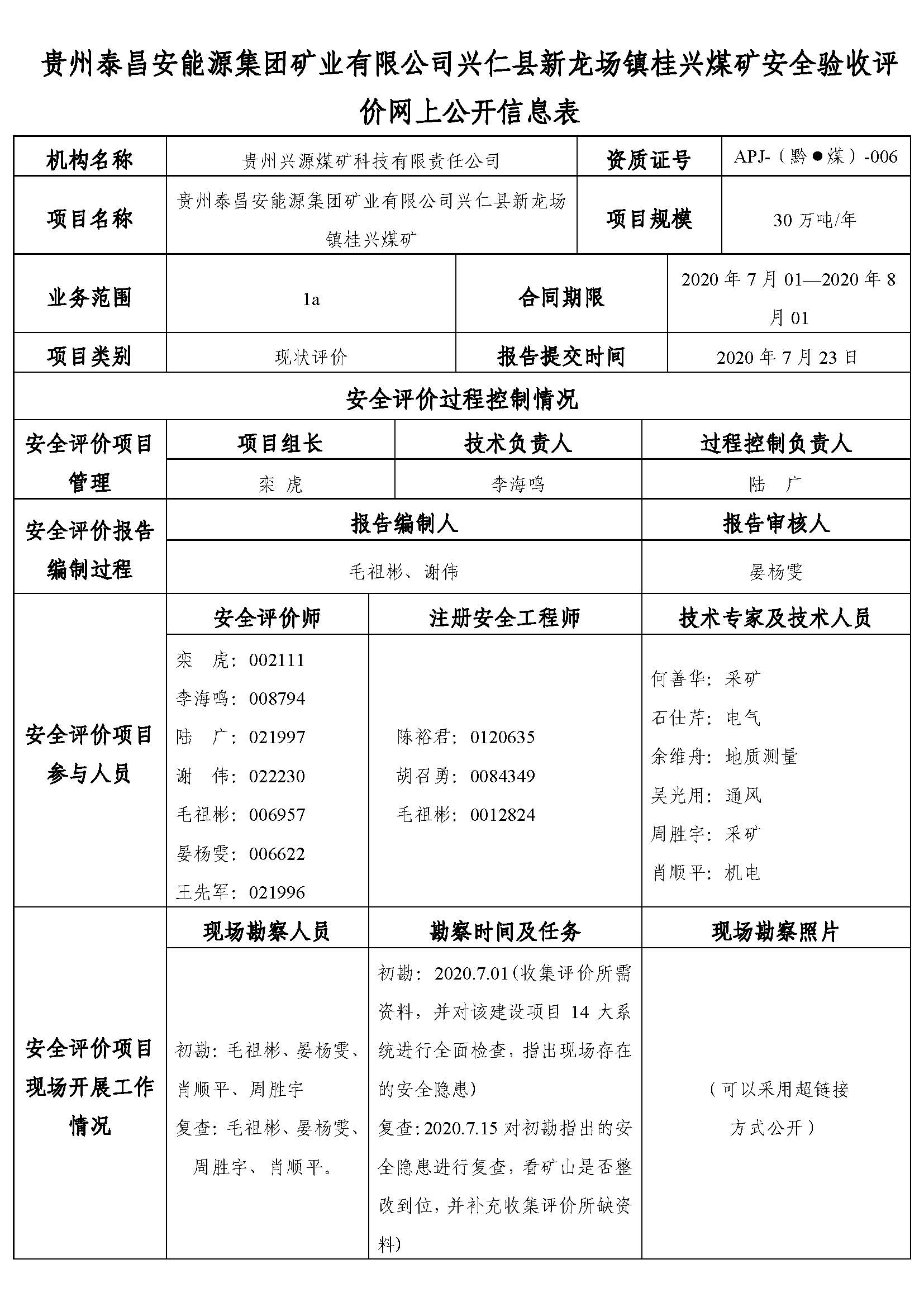 貴州泰昌安能源集團(tuán)礦業(yè)有限公司興仁縣新龍場(chǎng)鎮(zhèn)桂興煤礦安全驗(yàn)收評(píng)價(jià)網(wǎng)上公開(kāi)信息表