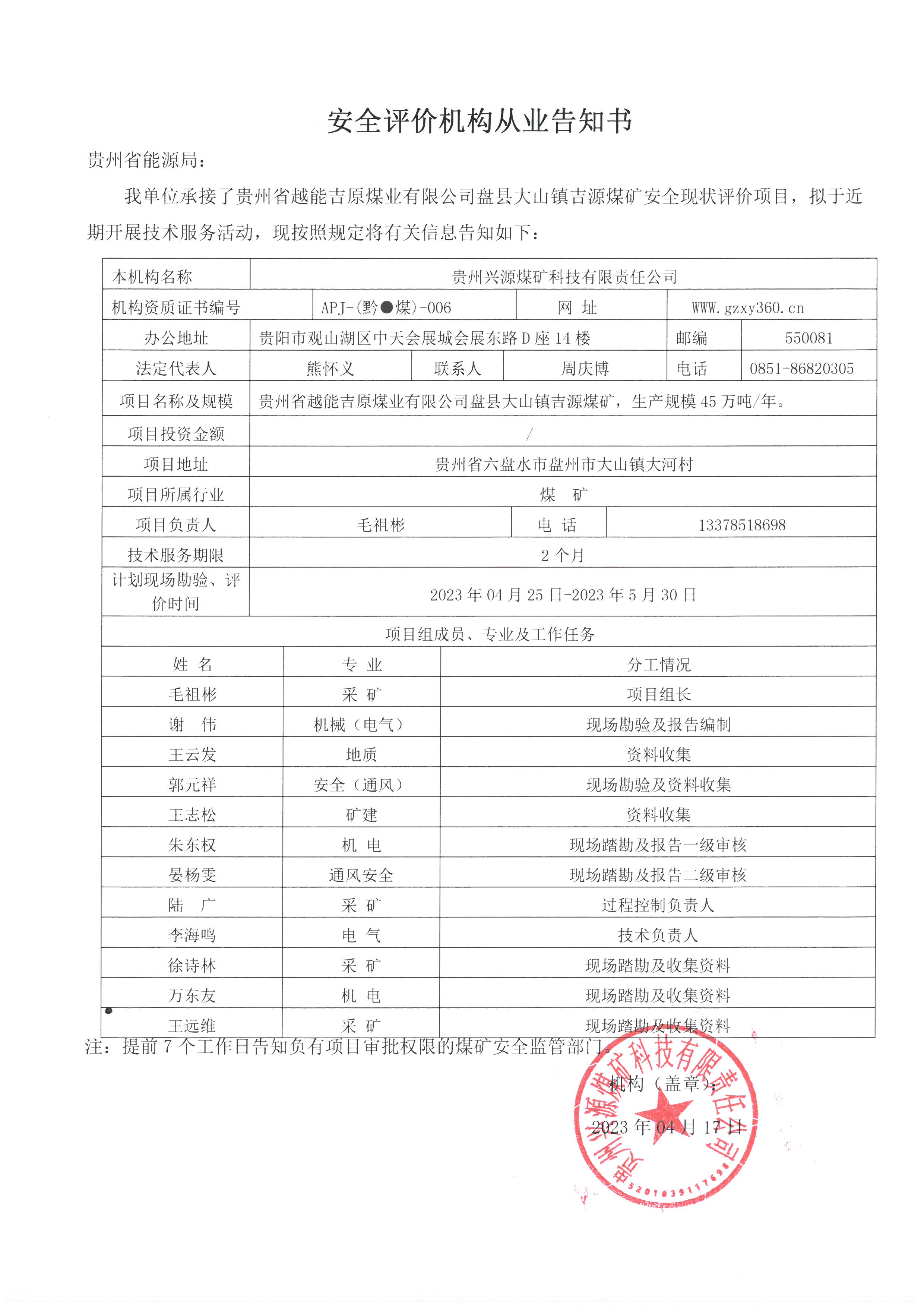 安全評(píng)價(jià)機(jī)構(gòu)從業(yè)告知書(shū)[貴州省越能吉原煤業(yè)有限公司盤(pán)縣大山鎮(zhèn)吉源煤礦]