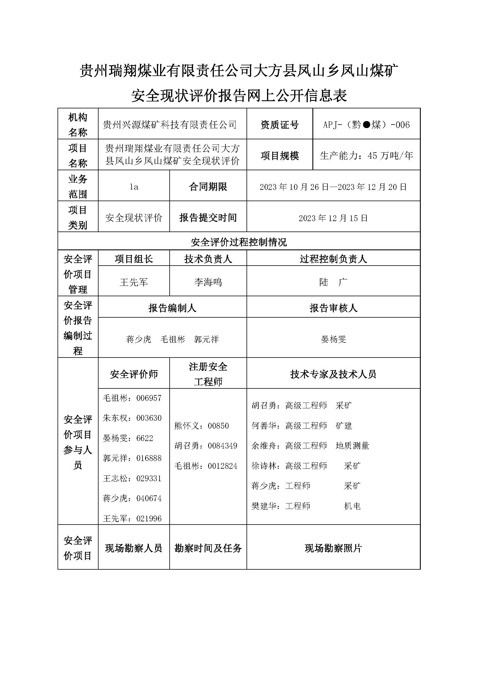 貴州瑞翔煤業(yè)有限責(zé)任公司大方縣鳳山鄉(xiāng)鳳山煤礦安全現(xiàn)狀評(píng)價(jià)報(bào)告網(wǎng)上公開(kāi)信息表
