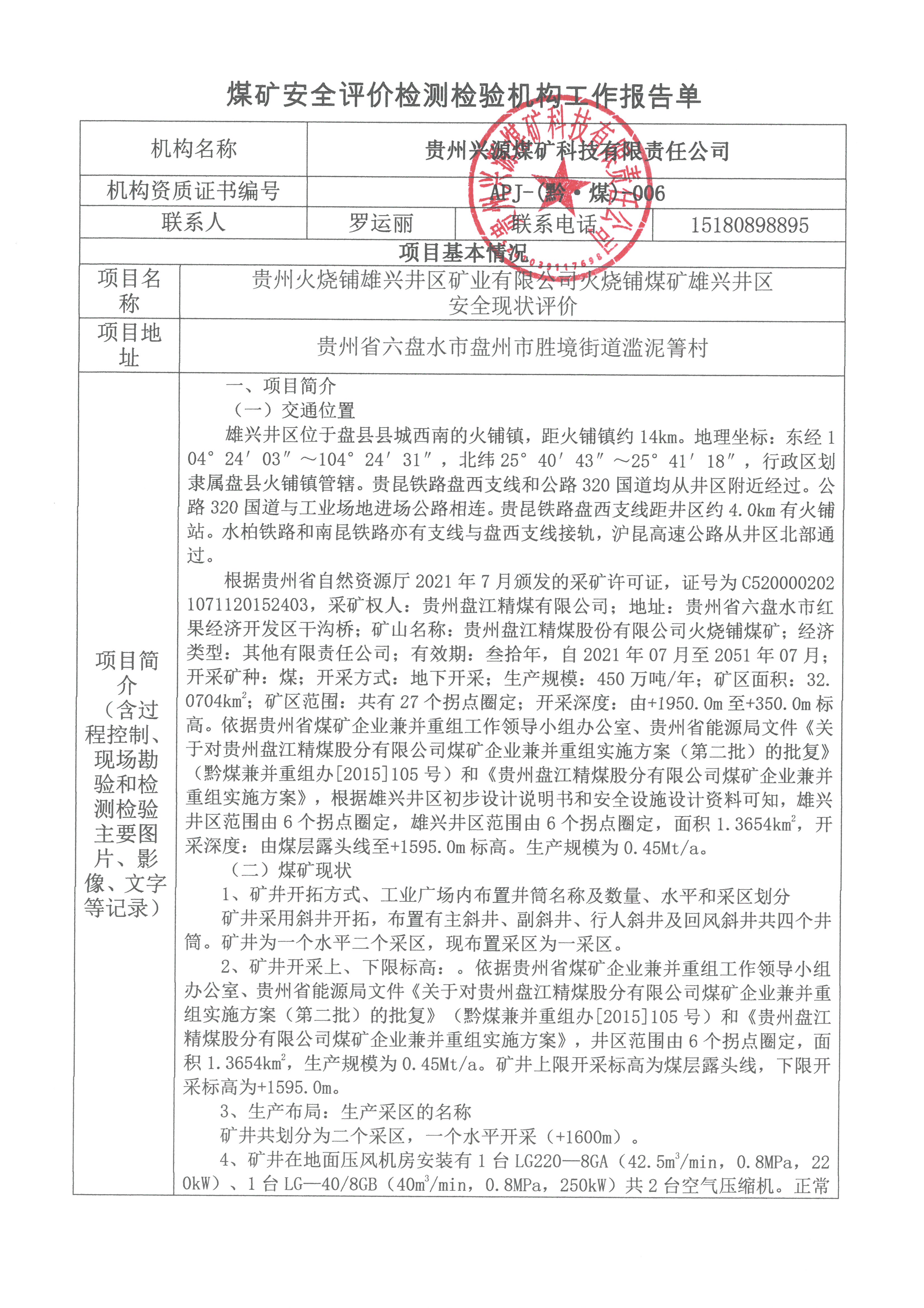 煤礦安全評(píng)價(jià)檢測(cè)檢驗(yàn)機(jī)構(gòu)工作報(bào)告單【貴州火燒鋪雄興井區(qū)礦業(yè)有限公司火燒鋪煤礦雄興井區(qū)安全現(xiàn)狀評(píng)價(jià)】