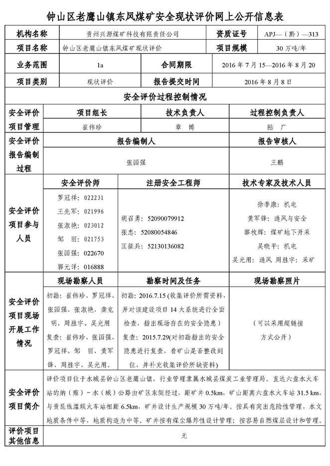 鐘山區(qū)老鷹山鎮(zhèn)東風(fēng)煤礦安全現(xiàn)狀評(píng)價(jià)網(wǎng)上公開(kāi)信息表