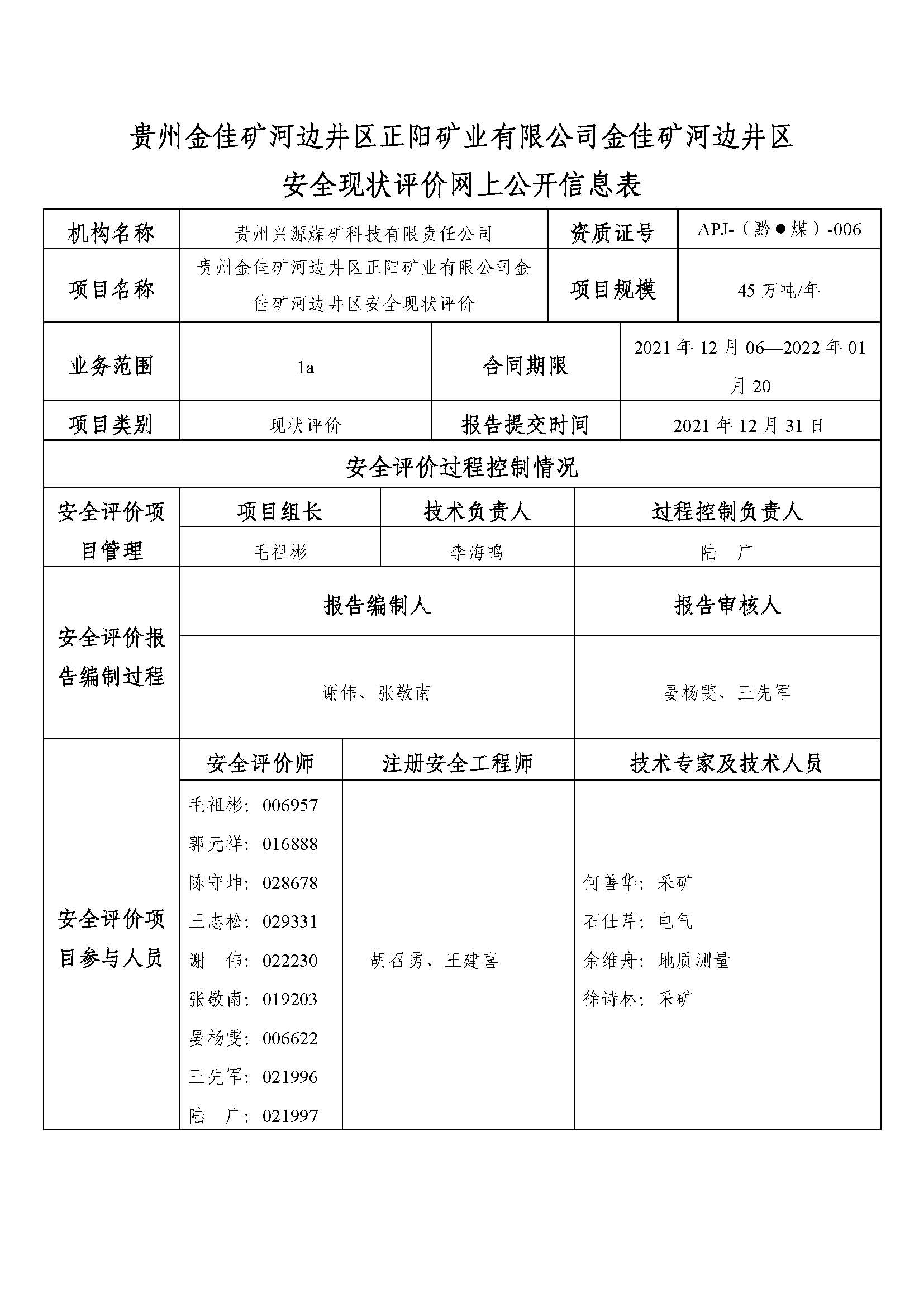 貴州金佳礦河邊井區(qū)正陽(yáng)礦業(yè)有限公司金佳礦河邊井區(qū)安全現(xiàn)狀評(píng)價(jià)網(wǎng)上公開(kāi)信息表