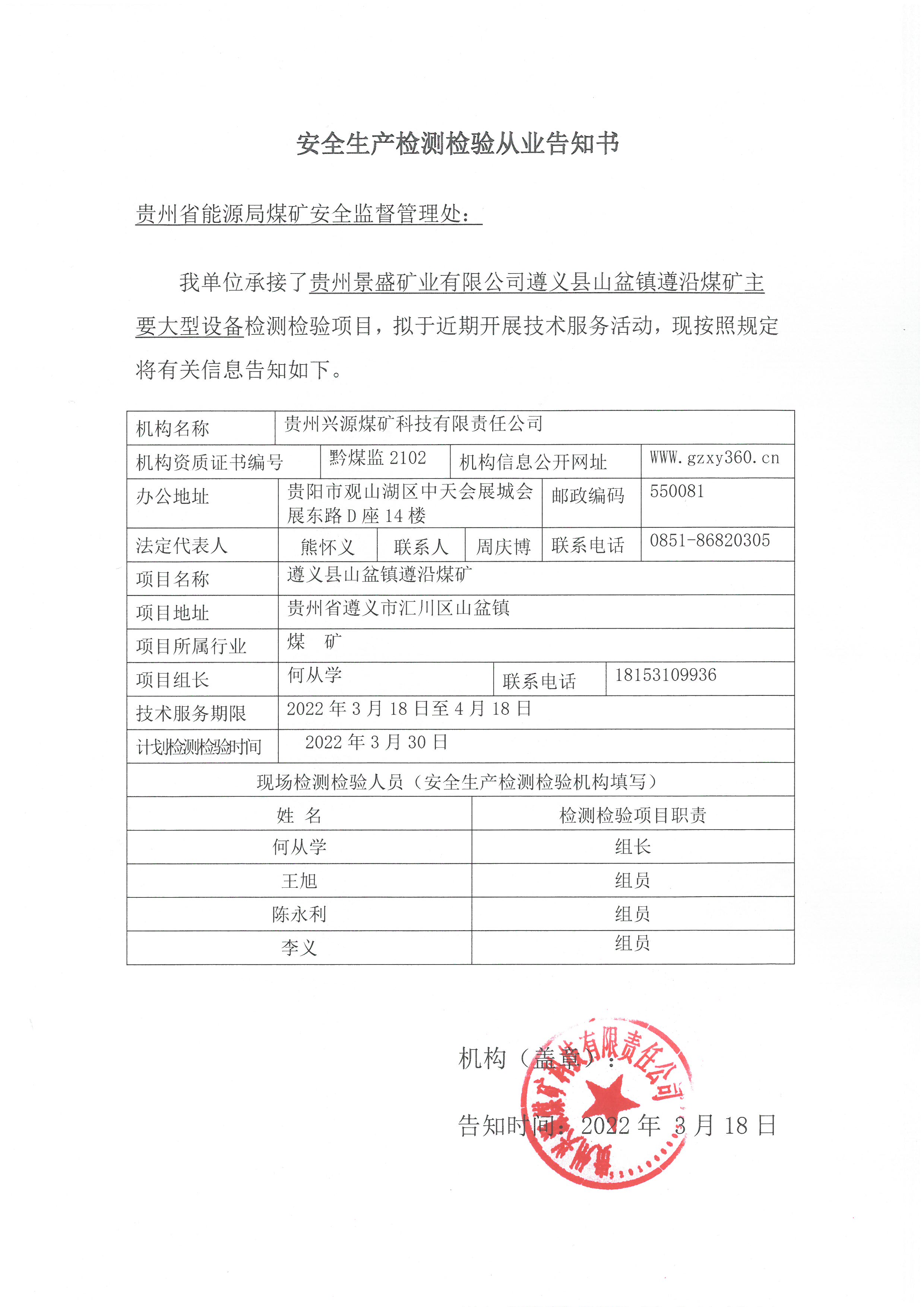 安全生產(chǎn)檢測(cè)檢驗(yàn)從業(yè)告知書(shū)【貴州景盛礦業(yè)有限公司遵義縣山盆鎮(zhèn)遵沿煤礦主要大型設(shè)備檢測(cè)檢驗(yàn)項(xiàng)目】