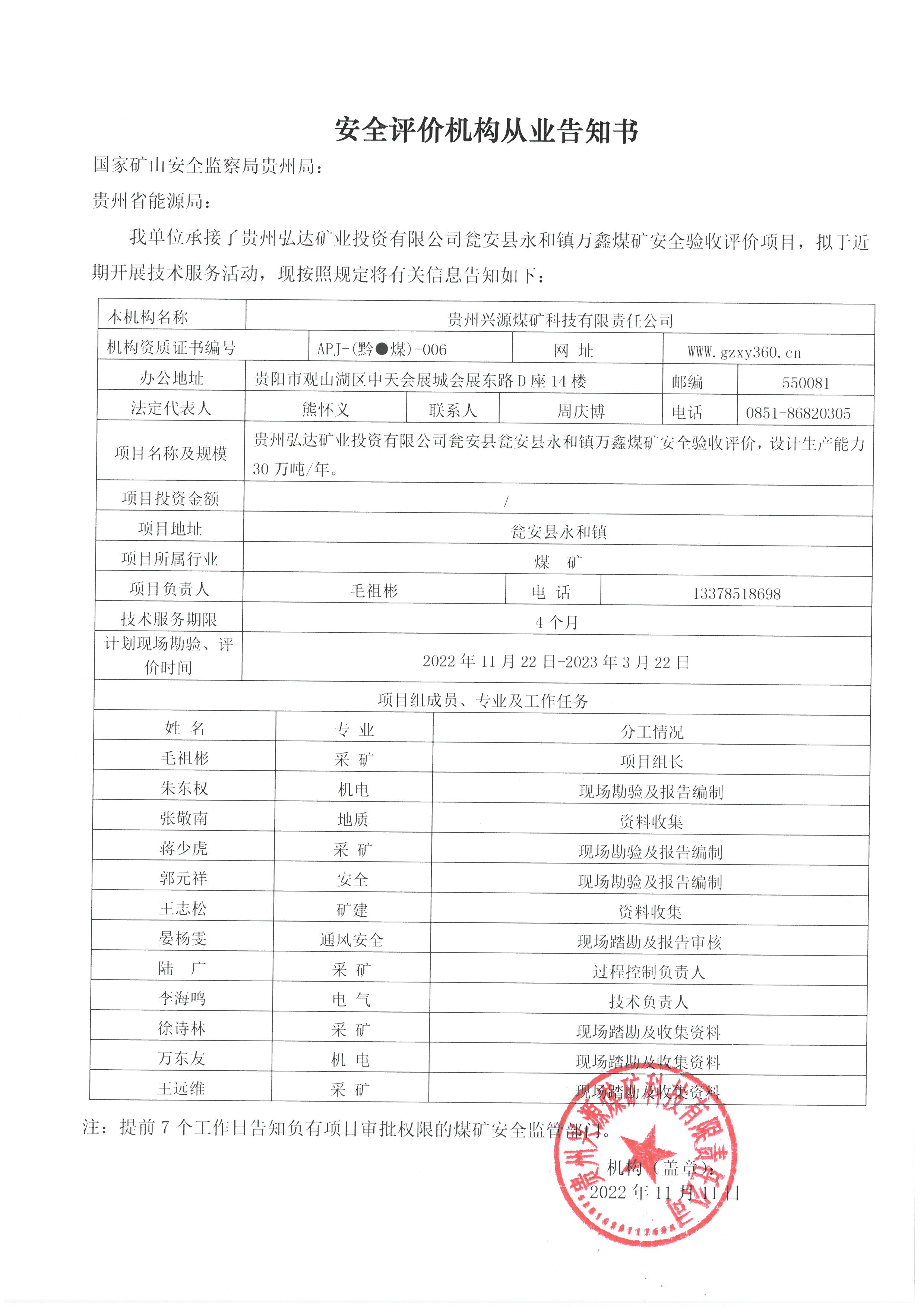 安全評(píng)價(jià)機(jī)構(gòu)從業(yè)告知書(shū)【貴州弘達(dá)礦業(yè)投資有限公司甕安縣永和鎮(zhèn)萬(wàn)鑫煤礦】