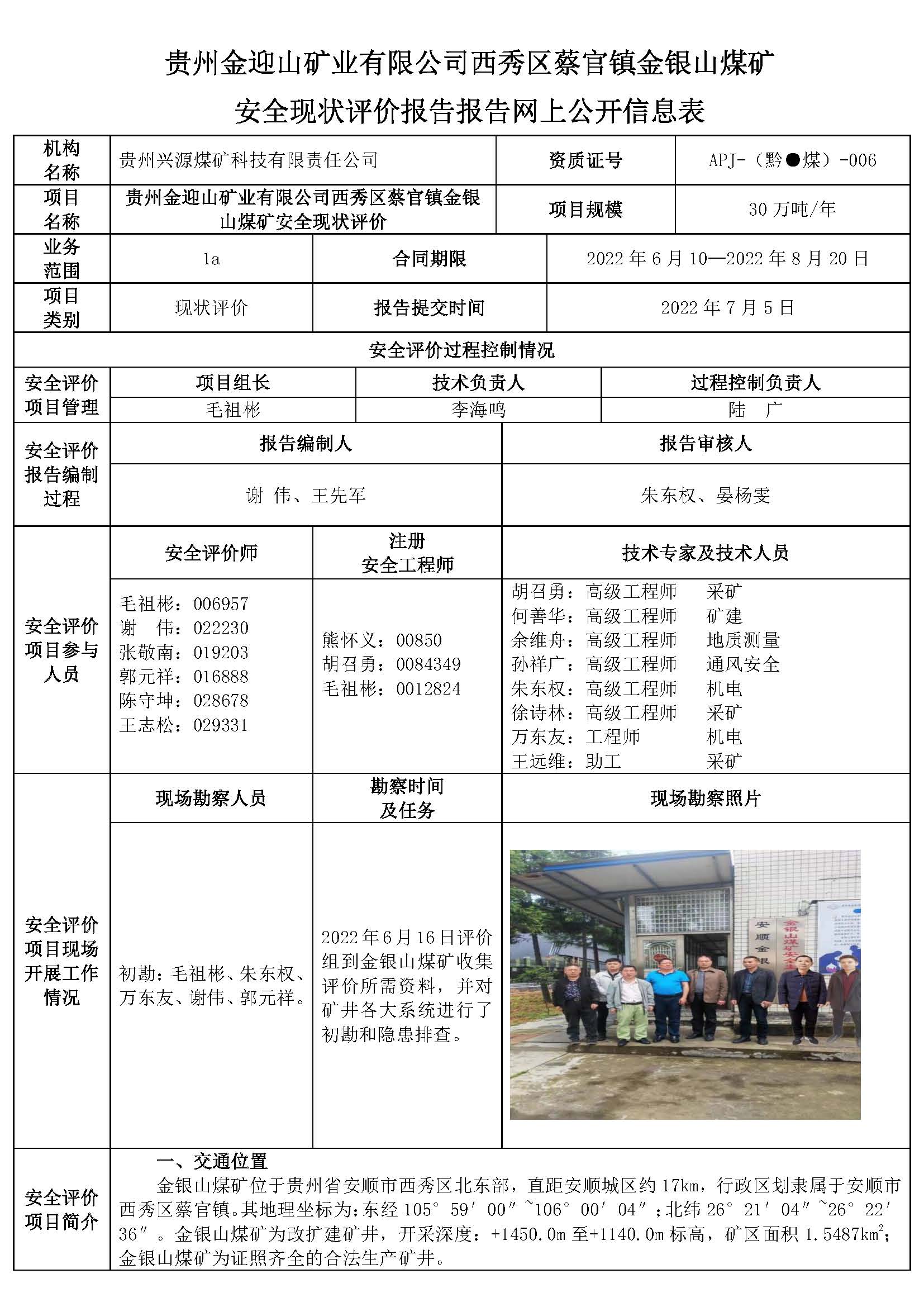 貴州金迎山礦業(yè)有限公司西秀區(qū)蔡官鎮(zhèn)金銀山煤礦安全現(xiàn)狀評價報告報告網(wǎng)上公開信息表