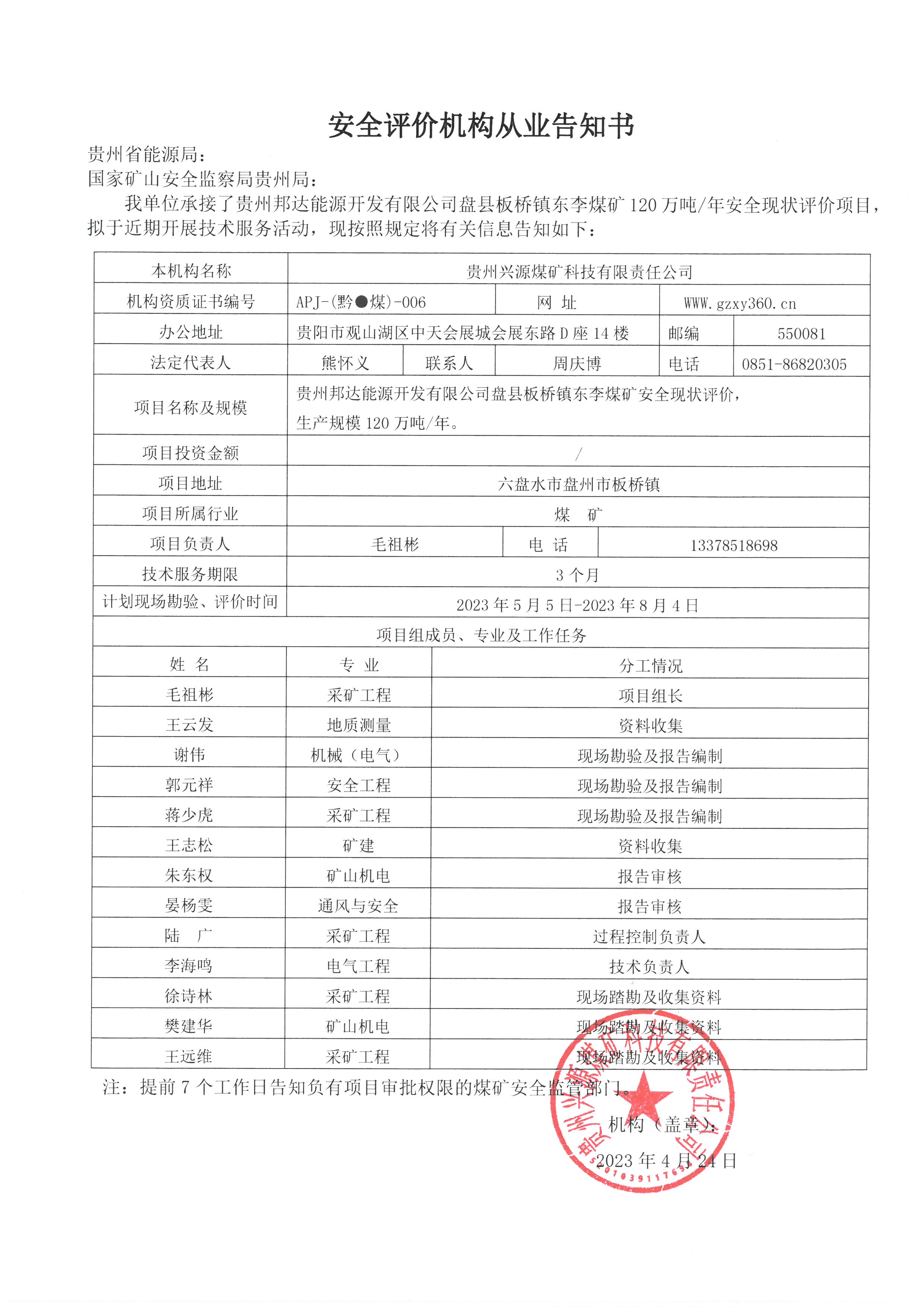 安全評(píng)價(jià)機(jī)構(gòu)從業(yè)告知書【貴州邦達(dá)能源開發(fā)有限公司盤縣板橋鎮(zhèn)東李煤礦】