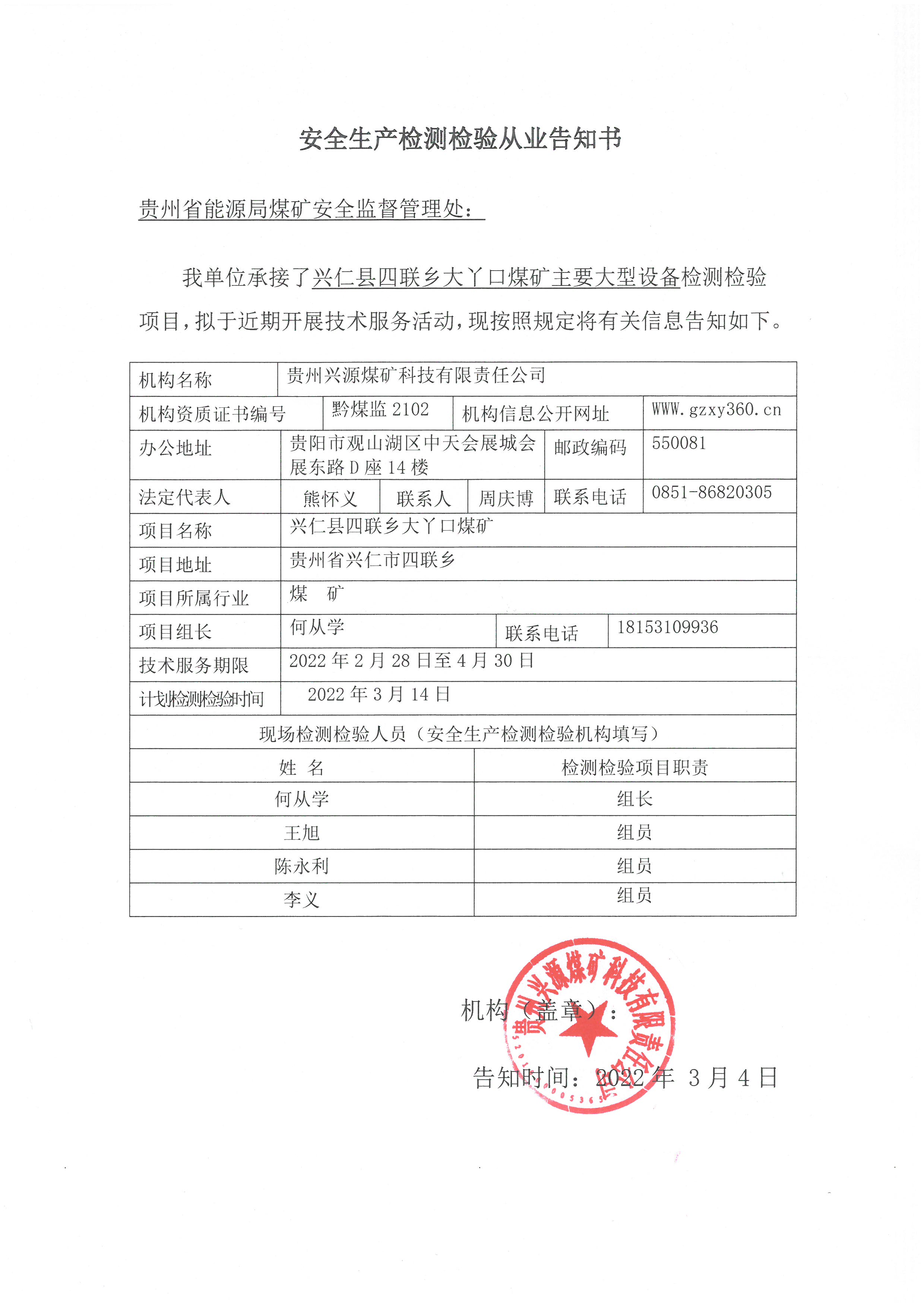 安全生產(chǎn)檢測(cè)檢驗(yàn)從業(yè)告知書【興仁縣四聯(lián)鄉(xiāng)大丫口煤礦主要大型設(shè)備檢測(cè)檢驗(yàn)】