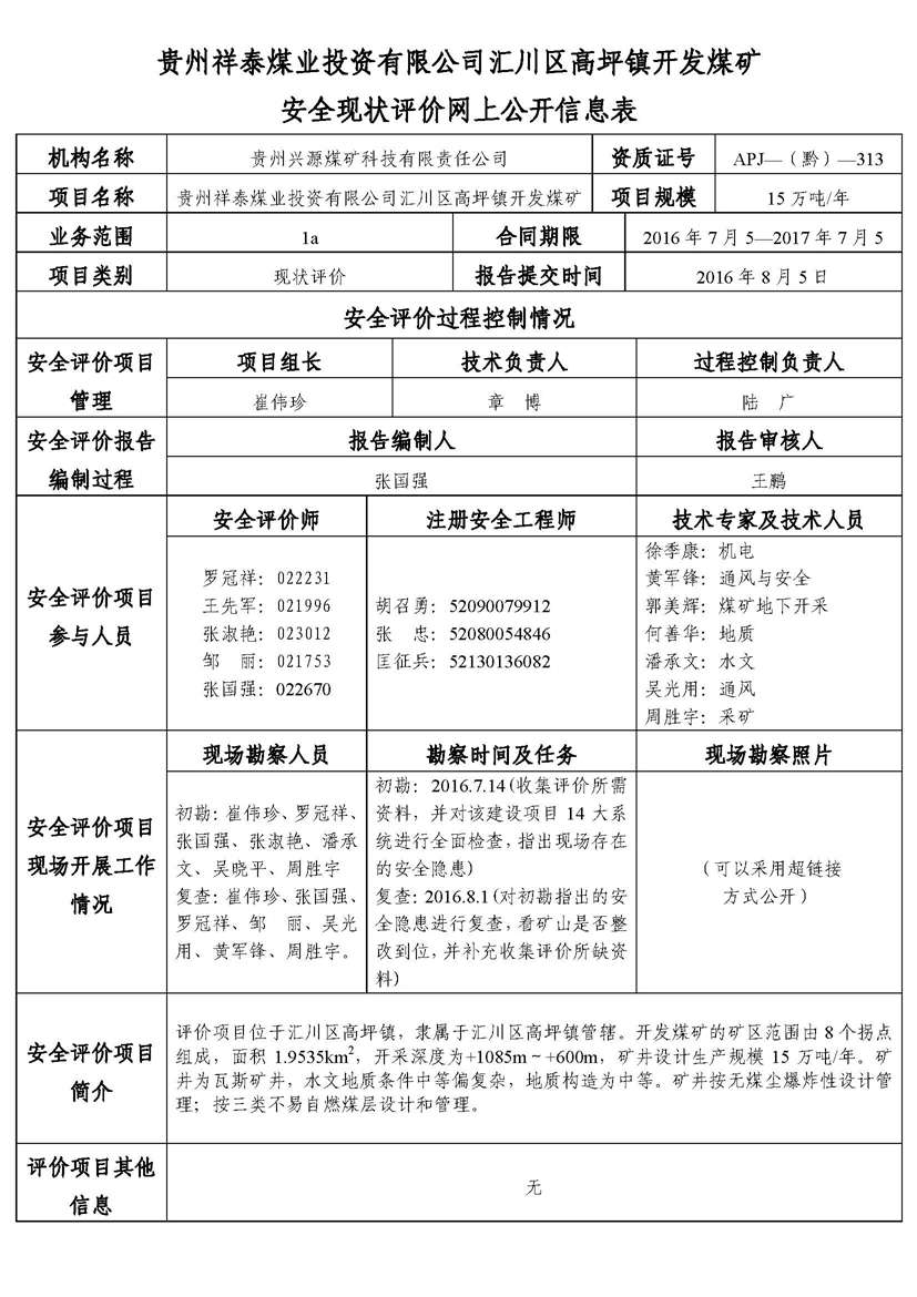 貴州祥泰煤業(yè)投資有限公司匯川區(qū)高坪鎮(zhèn)開發(fā)煤礦安全現(xiàn)狀評(píng)價(jià)網(wǎng)上公開信息表